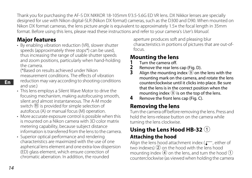 Thank you for purchasing the AF-S DX NIKKOR 18-105mm f/3.5-5.6G ED VR lens. DX Nikkor lenses are specially designed for use with Nikon digital-SLR (Nikon DX format) cameras, such as the D300 and D90. When mounted on Nikon DX format cameras, the lens picture angle is equivalent to approximately 1.5× the focal length in 35mm format. Before using this lens, please read these instructions and refer to your camera’s User’s Manual.