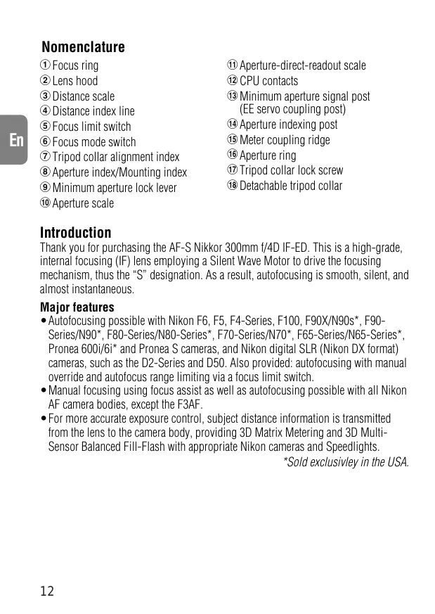 Introduction Thank you for purchasing the AF-S Nikkor 300mm f/4D IF-ED. This is a high-grade, internal focusing (IF) lens employing a Silent Wave Motor to drive the focusing mechanism, thus the “S” designation. As a result, autofocusing is smooth, silent, and almost instantaneous. Major features •Autofocusing possible with Nikon F6, F5, F4-Series, F100, F90X/N90s*, F90Series/N90*, F80-Series/N80-Series*, F70-Series/N70*, F65-Series/N65-Series*, Pronea 600i/6i* and Pronea S cameras, and Nikon digital SLR (Nikon DX format) cameras, such as the D2-Series and D50. Also provided: autofocusing with manual override and autofocus range limiting via a focus limit switch. •Manual focusing using focus assist as well as autofocusing possible with all Nikon AF camera bodies, except the F3AF. •For more accurate exposure control, subject distance information is transmitted from the lens to the camera body, providing 3D Matrix Metering and 3D MultiSensor Balanced Fill-Flash with appropriate Nikon cameras and Speedlights. *Sold exclusivley in the USA.