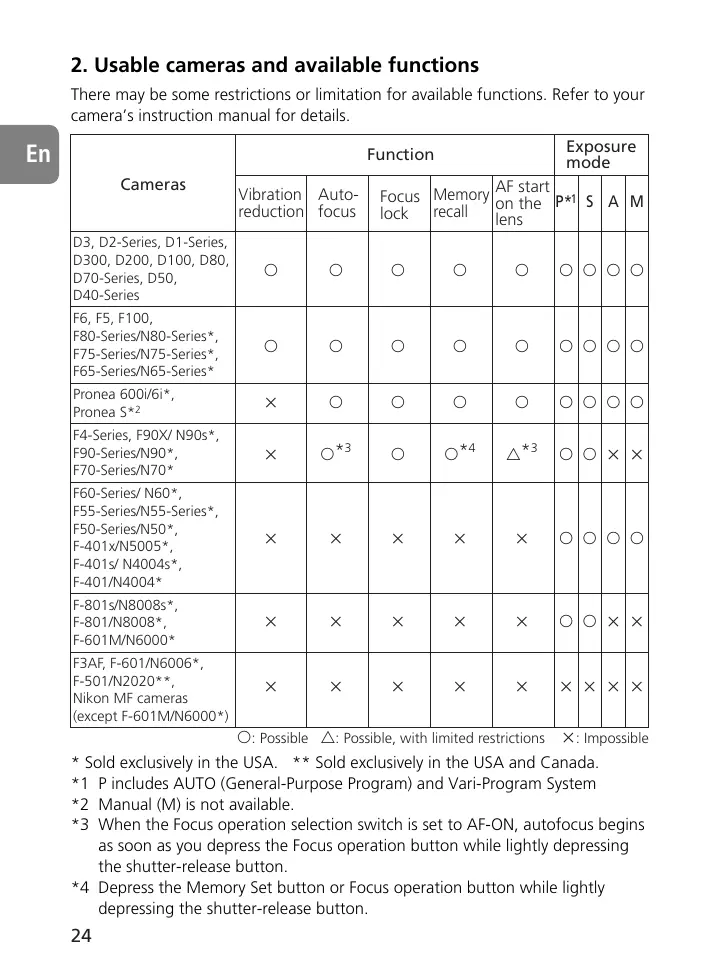 * Sold exclusively in the USA. ** Sold exclusively in the USA and Canada. *1 P includes AUTO (General-Purpose Program) and Vari-Program System *2 Manual (M) is not available. *3 When the Focus operation selection switch is set to AF-ON, autofocus begins as soon as you depress the Focus operation button while lightly depressing the shutter-release button. *4 Depress the Memory Set button or Focus operation button while lightly depressing the shutter-release button.