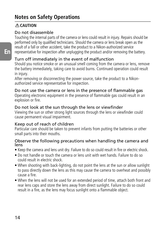 Touching the internal parts of the camera or lens could result in injury. Repairs should be performed only by qualified technicians. Should the camera or lens break open as the result of a fall or other accident, take the product to a Nikon-authorized service representative for inspection after unplugging the product and/or removing the battery.