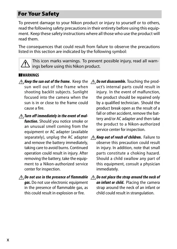 For Your Safety To prevent damage to your Nikon product or injury to yourself or to others, read the following safety precautions in their entirety before using this equip- ment. Keep these safety instructions where all those who use the product will read them. The consequences that could result from failure to observe the precautions listed in this section are indicated by the following symbol: This icon marks warnings. To prevent possible injury, read all warn- ings before using this Nikon product. WARNING À\ Keep the sun out of the frame. Keep the sun well out of the frame when shooting backlit subjects. Sunlight focused into the camera when the sun is in or close to the frame could cause a fire. \ Turn off immediately in the event of mal. function. Should you notice smoke or an unusual smell coming from the equipment or AC adapter (available separately), unplug the AC adapter and remove the battery immediately, taking care to avoid burns. Continued operation could result in injury. After removing the battery, take the equip- ment to à Nikon-authorized service center for inspection. À\ Do not use in the presence of flammable gas. Do not use electronic equipment in the presence of flammable gas, as this could result in explosion or ire. À\ Do not disassemble. Touching the prod- uct's internal parts could result in injury. In the event of malfunction, the product should be repaired only by a qualified technician. Should the product break open as the result of a fall or other accident, remove the bat- tery and/or AC adapter and then take the product to a Nikon-authorized service center for inspection. À\ Keep out of reach of children. Faïlure to observe this precaution could result in injury. In addition, note that small parts constitute a choking hazard. Should a child swallow any part of this equipment, consult a physician immediately. À\ Do not place the strap around the neck of an infant or child. Placing the camera strap around the neck of an infant or child could result in strangulation.