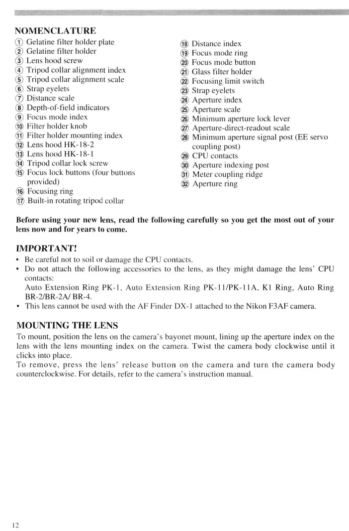 IMPORTANT! • Be careful not to soil or damage the CPU contacts. • Do not attach the following accessories to the lens, as they might damage the lens' CPU contacts: Auto Extension Ring PK-1, Auto Extension Ring PK-11/PK-l 1A, Kl Ring, Auto Ring BR-2/BR-2A/ BR-4. • This lens cannot be used with the AF Finder DX-1 attached to the Nikon F3AF camera.