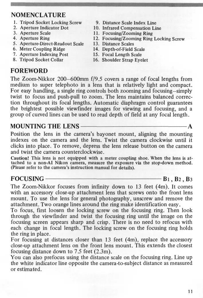 FOREWORD The Zoom-Nikkor 200—600mm f/9.5 covers a range of focal lengths from medium to super telephoto in a lens that is relatively light and compact. For easy handling, a single ring controls both zooming and focusing—simply twist to focus and push-pull to zoom. The lens maintains balanced correction throughout its focal lengths. Automatic diaphragm control guarantees the brightest possible viewfinder images for viewing and focusing, and a group of curved lines can be used to read depth of field at any focal length. MOUNTING THE LENS A Position the lens in the camera's bayonet mount, aligning the mounting indexes on the camera and the lens. Twist the camera clockwise until it clicks into place. To remove, depress the lens release button on the camera and twist the camera counterclockwise. Caution! This lens is not equipped with a meter coupling shoe. When the lens is attached to a non-AI Nikon camera, measure the exposure via the stop-down method. (Please refer to the camera's instruction manual for details).