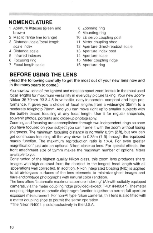 (Lea las siguientes instrucciones cuidadosamente para obtener el mayor rendimiento de su nuevo objetivo ahora y en los numerosos años venide- ros). Usted ahora posee uno de los cbjetivos zoom ms ligeros y compactos en las longitudes focales mâs utilizadas para una mâxima versatilidad en la toma coti- diana de fotografias. Su nuevo Zoom-Nikkor 35-70mm 1/3,3-4,5 es versätil, de fäcil operacién, compacto y de alto rendimiento. Le proporciona una variedad de longitudes focales a elecciôn, desde un granangular de 35mm hasta un teleob- ietivo moderado de 70mm. Usted puede aproximarse a objetos pequeños con el sistema de enfoque para macro incorporado que permite enfoques a cualquier longitud focal. Utilice este objetivo para fotografias normales, turisticas, retratos y primeros planos. Los controles del efecto zoom y del enfoque se efectüan mediante dos anillos in- dependientes de manera que una vez enfocado el objeto, usted puede cambiar el ajuste del efecto zoom sin alterar la nitidez. Las distancia de enfoque minima normalmente es de 0,5m (2 pies), pero el enfoque continuo es posible hasta una distancia minima de 0,35m (1 pie) gracias a la funciôn de macro equipada. La re- laciôn de reproducciôn mäxima es de 1:4.4. Para obtener una amplificaciôn aun mayor, sencillamente agregue un lente de aproximaciôn opcional Nikon. Para lograr efectos especiales, la montura delantera de 52mm permite utilizar un nû- mero mäximo de filtro opcionales. Fabricado de cristal Nikon de la mâs alta calidad, este objetivo zoom produce imâgenes nitidas de alto contraste desde la longitud focal minima a la mâxima ‘con una correccién eficiente de todas las aberraciones. Ademäs, el revestimiento. integrado de Nikon (NIC) aplicado a todas las superficies de lentes en contacto con el aire a fin de reducir al minimo el espectro secundario y la interreflexiôn. entre las superficies de las lentes y asegurar fotografias de colorido natural. Elobjetivo ofrece “registro automätico de la abertura mâxima” (AI) con las cäma- ras convenientement equipadas, gracias a la protuberancia de acoplamiento al 29