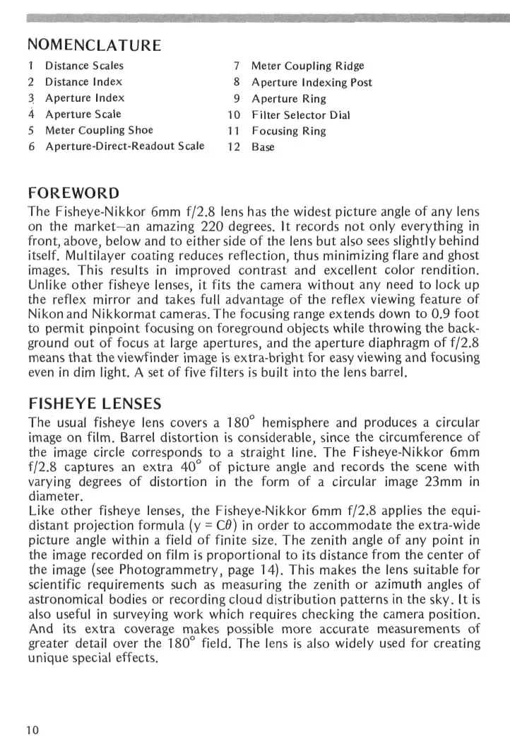 FOREWORD The Fisheye-Nikkor 6mm f/2.8 lens has the widest picture angle of any lens on the market-an amazing 220 degrees. It records not only everything in front, above, below and to either side of the lens but also sees slightly behind itself. Multilayer coating reduces reflection, thus minimizing flare and ghost images. This results in improved contrast and excellent color rendition.