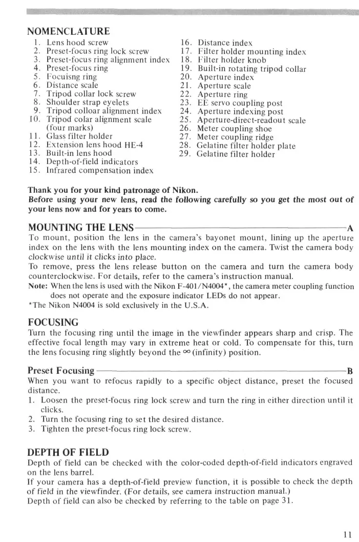 Preset-focus ring lock screw Preset-focus ring alignment index Preset-focus ring Focuisng ring Distance scale Tripod collar lock screw Shoulder strap eyelets Tripod colloar alignment index Tripod colar alignment scale (four marks) Glass filter holder Extension lens hood HE-4 Built-in lens hood Depth-of-field indicators Infrared compensation index
