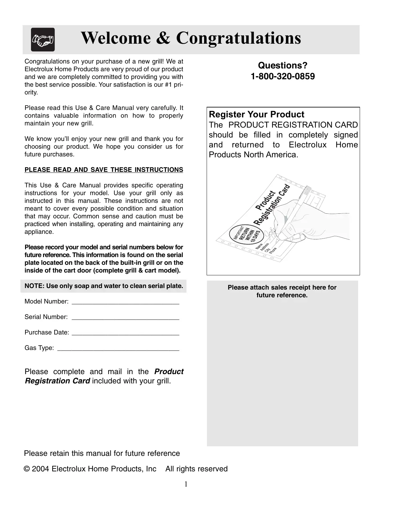 Congratulations on your purchase of a new grill! We at Electrolux Home Products are very proud of our product and we are completely committed to providing you with the best service possible. Your satisfaction is our #1 priority.