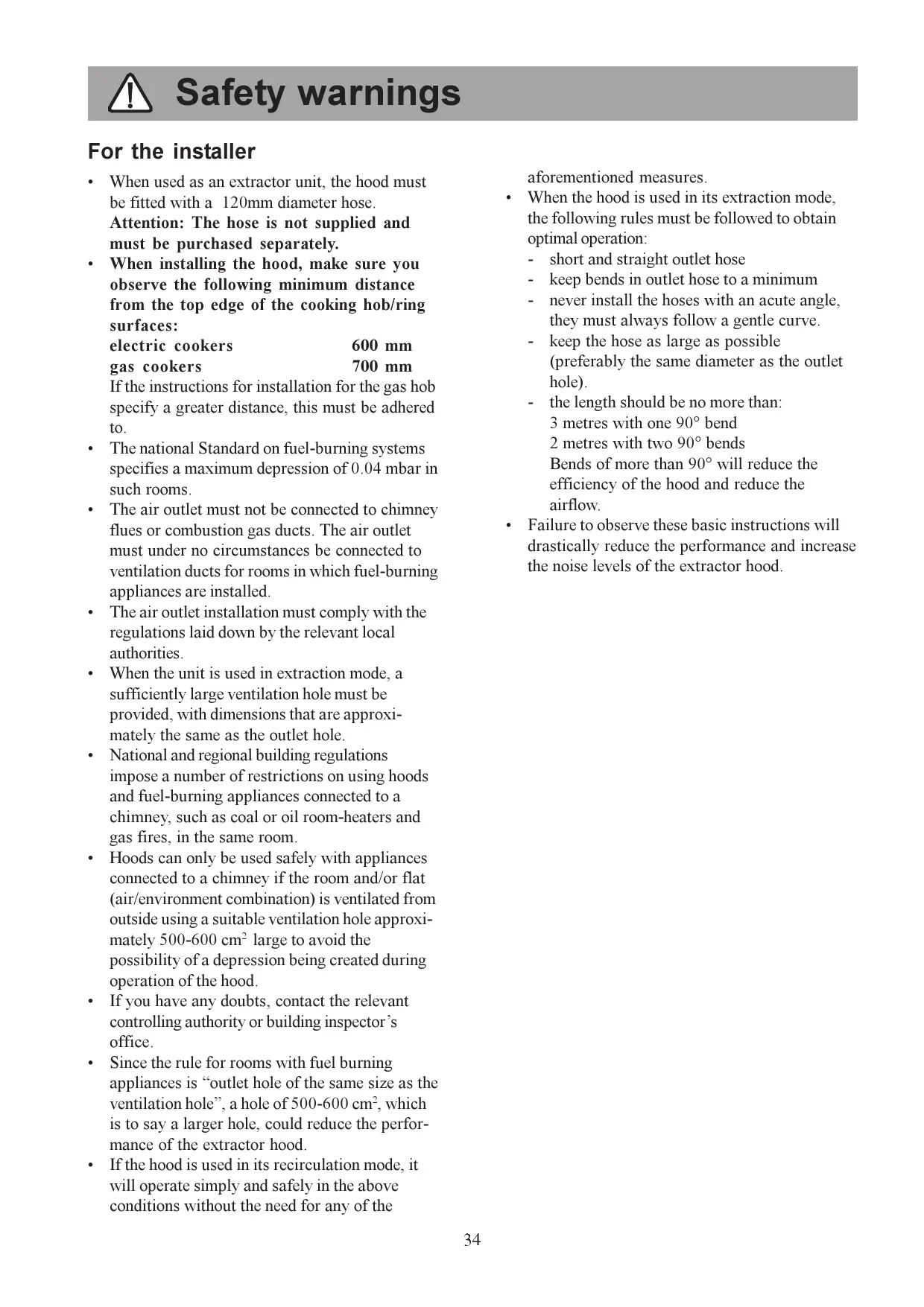 - Hoods can only be used safely with appliances connected to a chimney if the room and/or flat (air/environment combination) is ventilated from outside using a suitable ventilation hole approximately 500 - 600cm^2 large to avoid the possibility of a depression being created during operation of the hood.