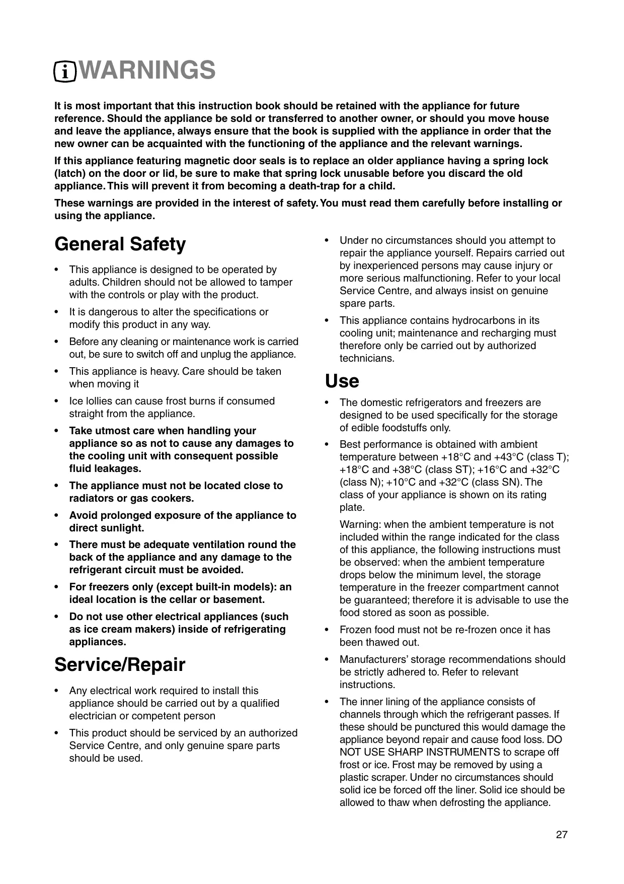 WARNINGS It is most important that this instruction book should be retained with the appliance for future reference. Should the appliance be sold or transferred to another owner, or should you move house and leave the appliance, always ensure that the book is supplied with the appliance in order that the new owner can be acquainted with the functioning of the appliance and the relevant warnings. If this appliance featuring magnetic door seals is to replace an older appliance having a spring lock (latch) on the door or lid, be sure to make that spring lock unusable before you discard the old appliance. This will prevent it from becoming a death-trap for a child. These warnings are provided in the interest of safety. You must read them carefully before installing or using the appliance. General Safety