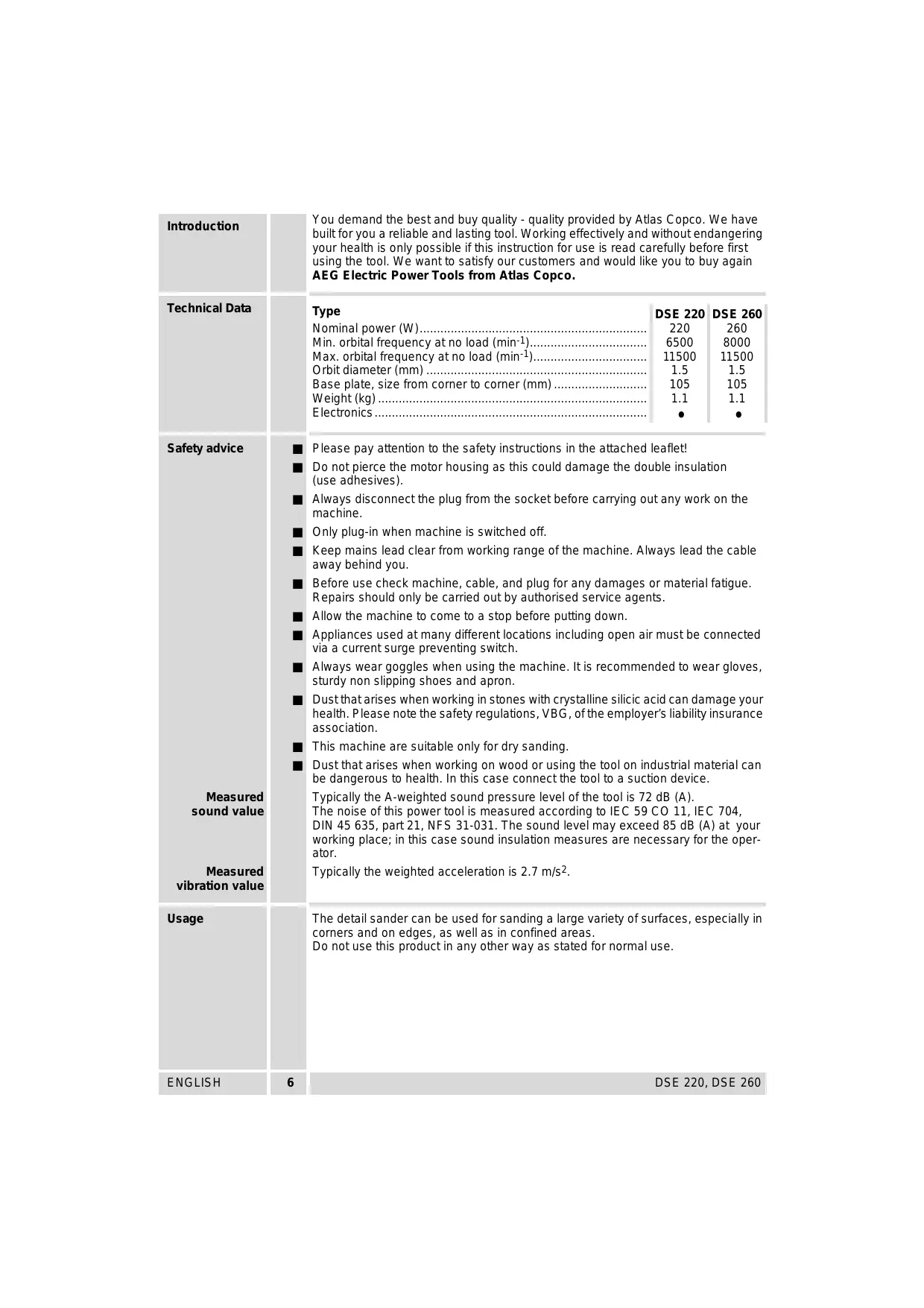 Introduction Technical Data Safety advice Measured sound value Measured vibration value Usage ENGLISH You demand the best and buy quality - quality provided by Atlas Copco. We have built for you a reliable and lasting tool. Working effectively and without endangering your health is only possible ifthis instruction for use is read carefully before first using the tool. We want to satisfy our customers and would like you to buy again AEG Electric Power Tools from Atlas Copco. Type DSE 220 DSE 260 Nominal power (W)... 220 260 Min. orbital frequency at no load (minr1 6500 8000 Max. orbital frequency at no load (min-1). 11500 | 11500 Orbit diameter (mm) … 15 1.5 Base plate, size from corner to corner (mm). 105 105 Weight (kg). 11 11 Electronics …… . . Please pay attention to the safety instructions in the attached leaflet! Do not pierce the motor housing as this could damage the double insulation (use adhesives). Always disconnect the plug from the socket before carrying out any work on the machine. Only plug-in when machine is switched off. Keep mains lead clear from working range ofthe machine. Always lead the cable away behind you Before use check machine, cable, and plug for any damages or material fatigue Repairs should only be carried out by authorised service agents. Allow the machine to come to a stop before putting down. Appliances used at many different locations including open air must be connected via a current surge preventing switch. Always wear goggles when using the machine. Itis recommended to wear gloves, sturdy non slipping shoes and apron. Dustthatarises when working in stones with crystalline silicic acid can damage your health. Please note the safety regulations, VBG, ofthe employers liability insurance association. This machine are suitable only for dry sanding. Dust that arises when working on wood or using the tool on industrial material can be dangerous to health. In this case connect the tool to a suction device. Typically the A-weighted sound pressure level of the tool is 72 dB (A). The noise of this power tool is measured according to IEC 59 CO 11, IEC 704, DIN 45 635, part 21, NFS 31-031. The sound level may exceed 85 dB (A) at your working place: in this case sound insulation measures are necessary for the oper- ator. Typically the weighted acceleration is 2.7 m/s2. The detail sander can be used for sanding a large variety of surfaces, especially in comers and on edges, as well as in confined areas Do notuse this product in any other way as stated for normal use. DSE 220, DSE 260