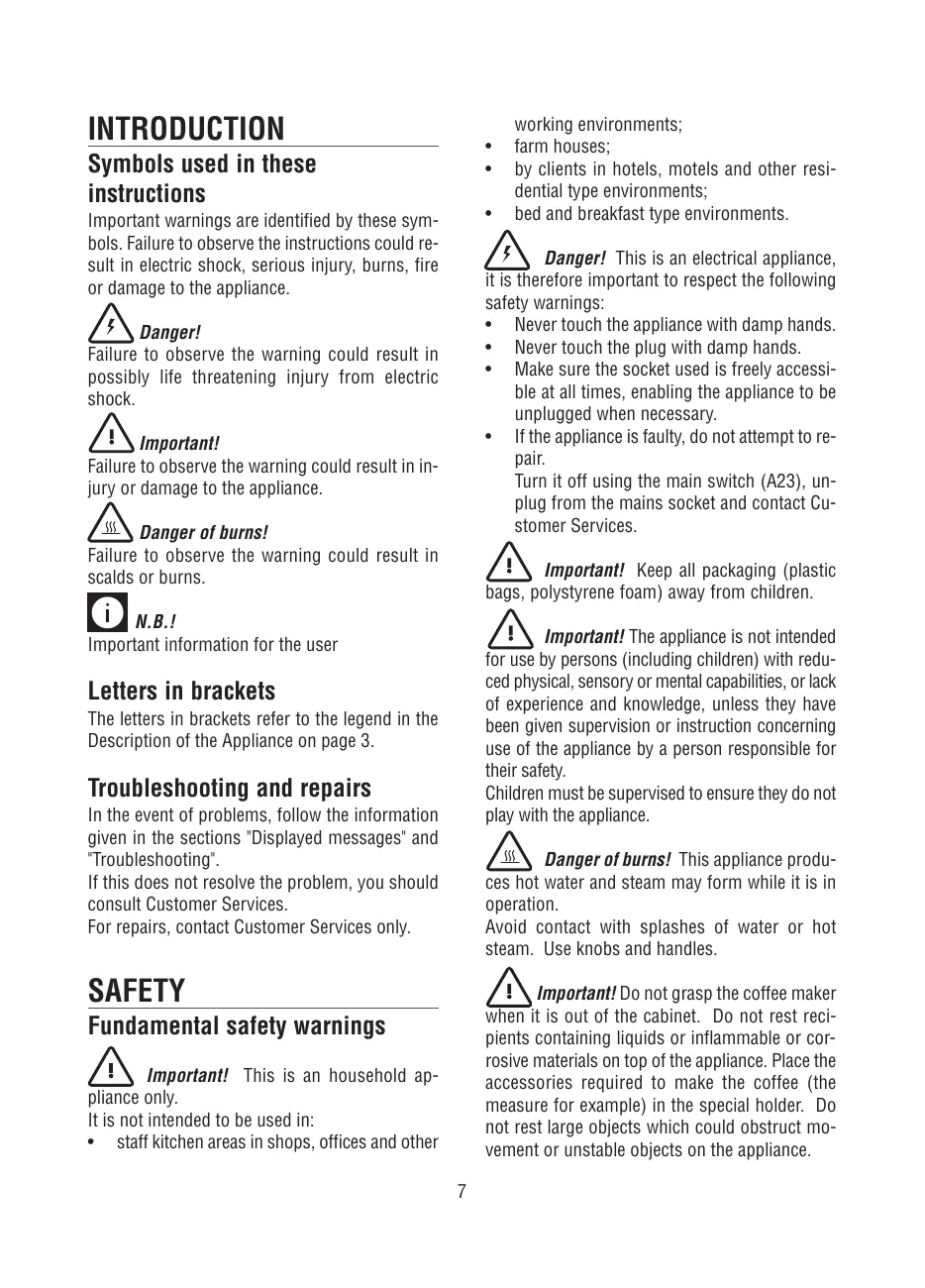 INTRODUCTION Symbols used in these instructions Important warnings are identified by these sym- bols. Failure to observe the instructions could re- sult in electric shock, serious injury, burns, fire or damage to the appliance. Danger! Failure to observe the warning could result in possibly life threatening injury from electric shock. A Important! Failure to observe the warning could result in in- jury or damage to the appliance. Danger of burns! Failure to observe the warning could result in scalds or burns. [© AB. Important information for the user Letters in brackets The letters in brackets refer to the legend in the Description of the Appliance on page 3. Troubleshooting and repairs In the event of problems, follow the information given in the sections "Displayed messages" and “Troubleshooting". Ifthis does not resolve the problem, you should consult Customer Services. For repairs, contact Customer Services only. SAFETY working environments; + farmhouses; + by clients in hotels, motels and other resi- dential type environments; + bed and breakfast type environments. VAN Danger! This is an electrical appliance, itis therefore important to respect the following safety \varnings: + Never touch the appliance with damp hands. + Never touch the plug with damp hands. + Make sure the socket used is freely accessi- ble at all times, enabling the appliance to be unplugged when necessary. + Ifthe appliance is faulty, do not attempt to re- pair. Turn it off using the main switch (A23), un- plug from the mains socket and contact Cu- stomer Services. VAN Important! Keep all packaging (plastic bags, polystyrene foam) away from children. VAN Important! The appliance is not intended for use by persons (including children) with redu- ced physical, sensory or mental capabilities, or lack of experience and knowledge, unless they have been given supervision or instruction concerning use of the appliance by a person responsible for their safety. Children must be supervised to ensure they do not play with the appliance. VAN Danger of burns! This appliance produ- ces hot water and steam may form while it is in operation. Avoid contact with splashes of water or hot steam. Use knobs and handles. AN Important! Do not grasp the coffee maker Fundamental safety warnings VAN Important! This is an household ap- pliance only. Itis not intended to be used in: + staff kitchen areas in shops, offices and other when it is out of the cabinet. Do not rest reci- pients containing liquids or inflammable or cor- rosive materials on top of the appliance. Place the accessories required to make the coffee (the measure for example) in the special holder. Do not rest large objects which could obstruct mo- vement or unstable objects on the appliance.