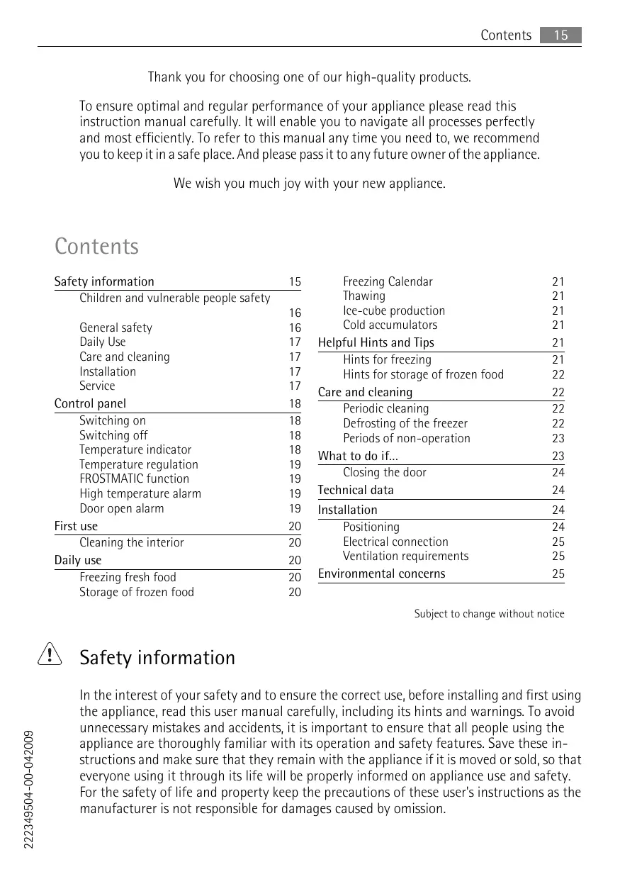 Thank you for choosing one of our high-quality products. To ensure optimal and regular performance of your appliance please read this instruction manual carefully. It will enable you to navigate all processes perfectly and most efficiently. To refer to this manual any time you need to, we recommend you to keep it in a safe place. And please pass it to any future owner of the appliance. We wish you much joy with your new appliance. Contents Safety information Children and vulnerable people safety General safety Daily Use Care and cleaning Installation Service Control panel Switching on Switching off Temperature indicator Temperature regulation FROSTMATIC function High temperature alarm Door open alarm First use Cleaning the interior Daily use Freezing fresh food Storage of frozen food