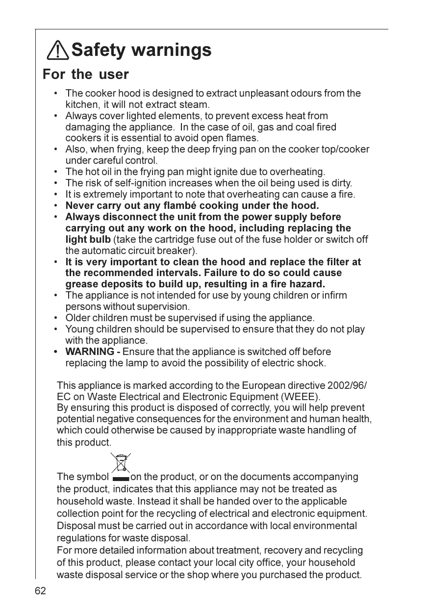 A\Safety warnings For the user + _ The cooker hoodis designed to extract unpleasant odours from the kitchen, it will not extract steam. + Always cover lighted elements, to prevent excess heat from damaging the appliance. In the case of oil, gas and coal fired cookers it is essential to avoid open flames. + Also, when frying, keep the deep frying pan on the cooker top/cooker under careful control. + The hot oil in the frying pan might ignite due to overheating. + The risk of self-ignition increases when the oil being used is dirty. + _Itis extremely important to note that overheating can cause a fire. + Never carry out any flambé cooking under the hood. + _ Always disconnect the unit from the power supply before carrying out any work on the hood, including replacing the light bulb (take the cartridge fuse out of the fuse holder or switch off the automatic circuit breaker). + is very important to clean the hood and replace the filter at the recommended intervals. Failure to do so could cause grease deposits to build up, resulting in a fire hazard. + The appliance is not intended for use by young children or infirm persons without supervision. + Older children must be supervised if using the appliance. + Young children should be supervised to ensure that they do not play With the appliance. +. WARNING - Ensure that the appliance is switched off before replacing the lamp to avoid the possibility of electric shock. This appliance is marked according to the European directive 2002/96/ EC on Waste Electrical and Electronic Equipment (WEEE). By ensuring this product is disposed of correcily, you will help prevent potential negative consequences for the environment and human health, which could otherwise be caused by inappropriate waste handling of this product. The symbol mms On the product, or on the documents accompanying the product, indicates that this appliance may not be treated as household waste. Instead it shall be handed over to the applicable collection point for the recycling of electrical and electronic equipment. Disposal must be carried out in accordance with local environmental regulations for waste disposal. For more detailed information about treatment, recovery and recycling of this product, please contact your local city office, your household waste disposal service or the shop where you purchased the product.