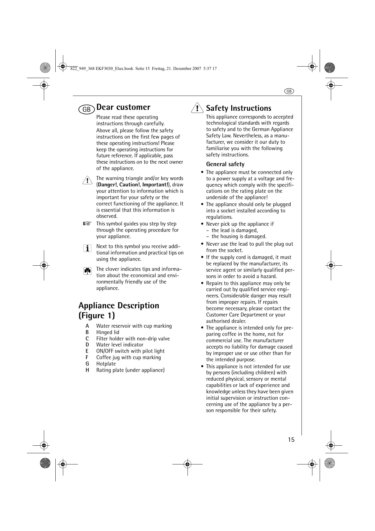 Water reservoir with cup marking Hinged lid Filter holder with non-drip valve Water level indicator ON/OFF switch with pilot light Coffee jug with cup marking Hotplate Rating plate (under appliance) 1 Safety Instructions This appliance corresponds to accepted technological standards with regards to safety and to the German Appliance Safety Law. Nevertheless, as a manufacturer, we consider it our duty to familiarise you with the following safety instructions. General safety