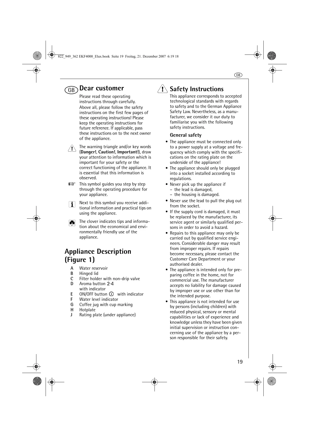 Dear customer Please read these operating instructions through carefully. Above all, please follow the safety instructions on the first few pages of these operating instructions! Please keep the operating instructions for future reference. If applicable, pass these instructions on to the next owner of the appliance. The warning triangle and/or key words (Danger!, Caution!, Important!) draw your attention to information which is important for your safety or the correct functioning of the appliance. ft is essential that this information is observed. This symbol guides vou step by step through the operating procedure for your appliance. Next to this symbol you receive addi- tional information and practical tips on using the appliance. The clover indicates tips and informa- tion about the economical and envi- ronmentally friendly use of the appliance. Appliance Description (Figure 1) ovnwx> eronm Water reservoir Hinged lid Filter holder with non-drip valve Aroma button 2-4 with indicator ON/OFF button © with indicator Water level indicator Coffee jug with cup marking Hotplate Rating plate (under appliance) A Safety Instructions This appliance corresponds to accepted technological standards with regards to safety and to the German Appliance Safety Law. Nevertheless, as a manu- facturer, we consider it our duty to familiarise you with the following safety instructions. General safety The appliance must be connected only to a power supply at a voltage and fre- quency which comply with the specifi- cations on the rating plate on the underside of the appliance! The appliance should only be plugged into a socket installed according to regulations. Never pick up the appliance if = the lead is damaged, = the housing is damaged. Never use the lead to pull the plug out from the socket. If the supply cord is damaged, it must be replaced by the manufacturer, its service agent or similarly qualified per- sons in order to avoid a hazard. Repairs to this appliance may only be carried out by qualified service engi- neers. Considerable danger may result from improper repairs. If repairs become necessary, please contact the Customer Care Department or your authorised dealer. The appliance is intended only for pre- paring coffee in the home, not for commercial use. The manufacturer accepts no liability for damage caused by improper use or use other than for the intended purpose. This appliance is not intended for use by persons (including children) with reduced physical, sensory or mental capabilities or lack of experience and knowledge unless they have been given initial supervision or instruction con- cerning use of the appliance by a per- son responsible for their safety.