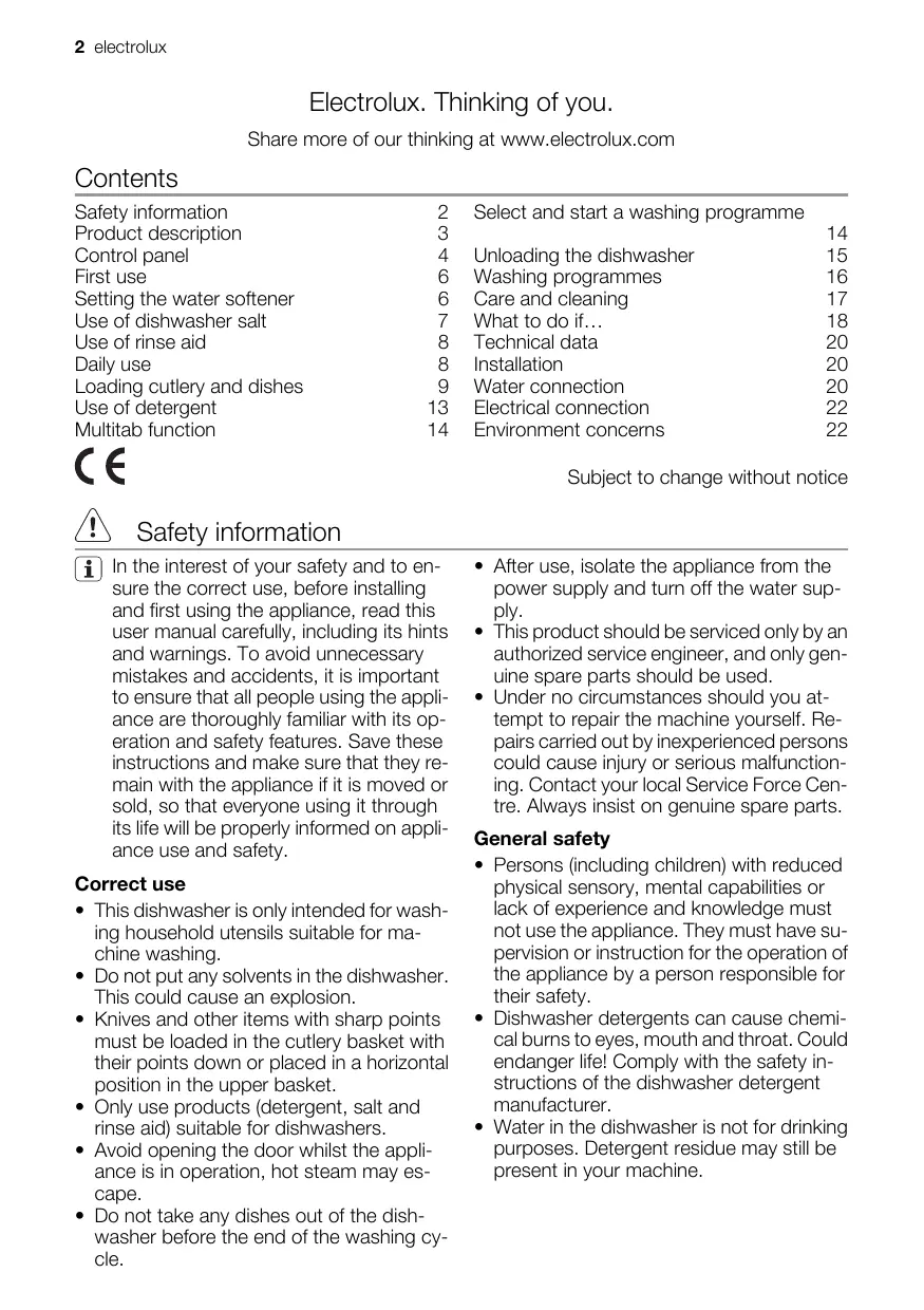 2 electrolux Electrolux. Thinking of you. Share more of our thinking at www.electrolux.com Contents Safety information Product description Control panel First use Setting the water softener Use of dishwasher salt Use of rinse aid Daily use Loading cutlery and dishes Use of detergent Multitab function