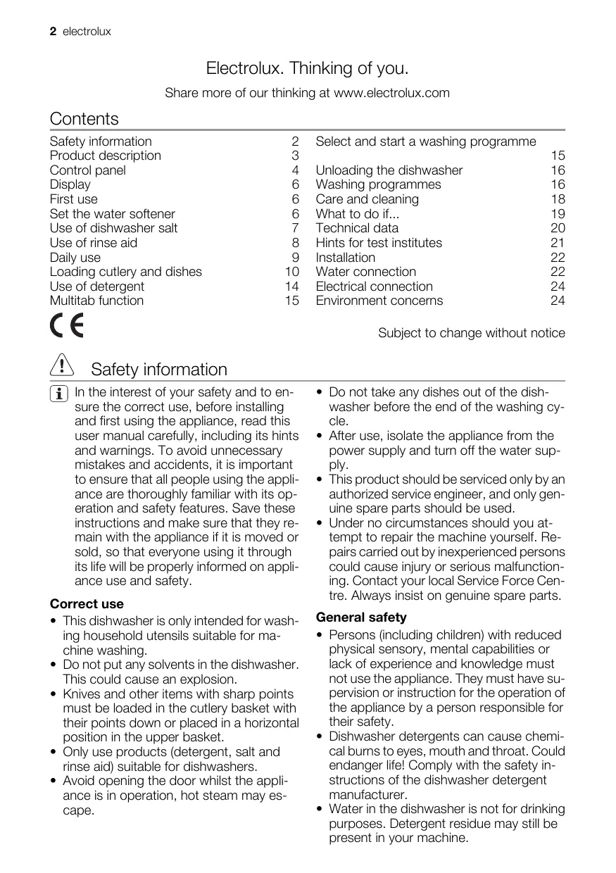 2 electrolux Electrolux. Thinking of you. Share more of our thinking at www.electrolux.com Contents Safety information 2 Product description 3 Control panel 4 Display 6 First use 6 Set the water softener 6 Use of dishwasher salt 7 Use of rinse aid 8 Daily use 9 Loading cutlery and dishes 10 Use of detergent 14 Multitab function 15