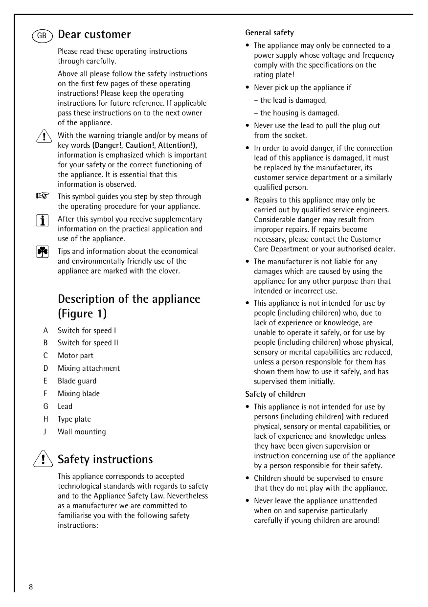 - In order to avoid danger, if the connection lead of this appliance is damaged, it must be replaced by the manufacturer, its customer service department or a similarly qualified person.