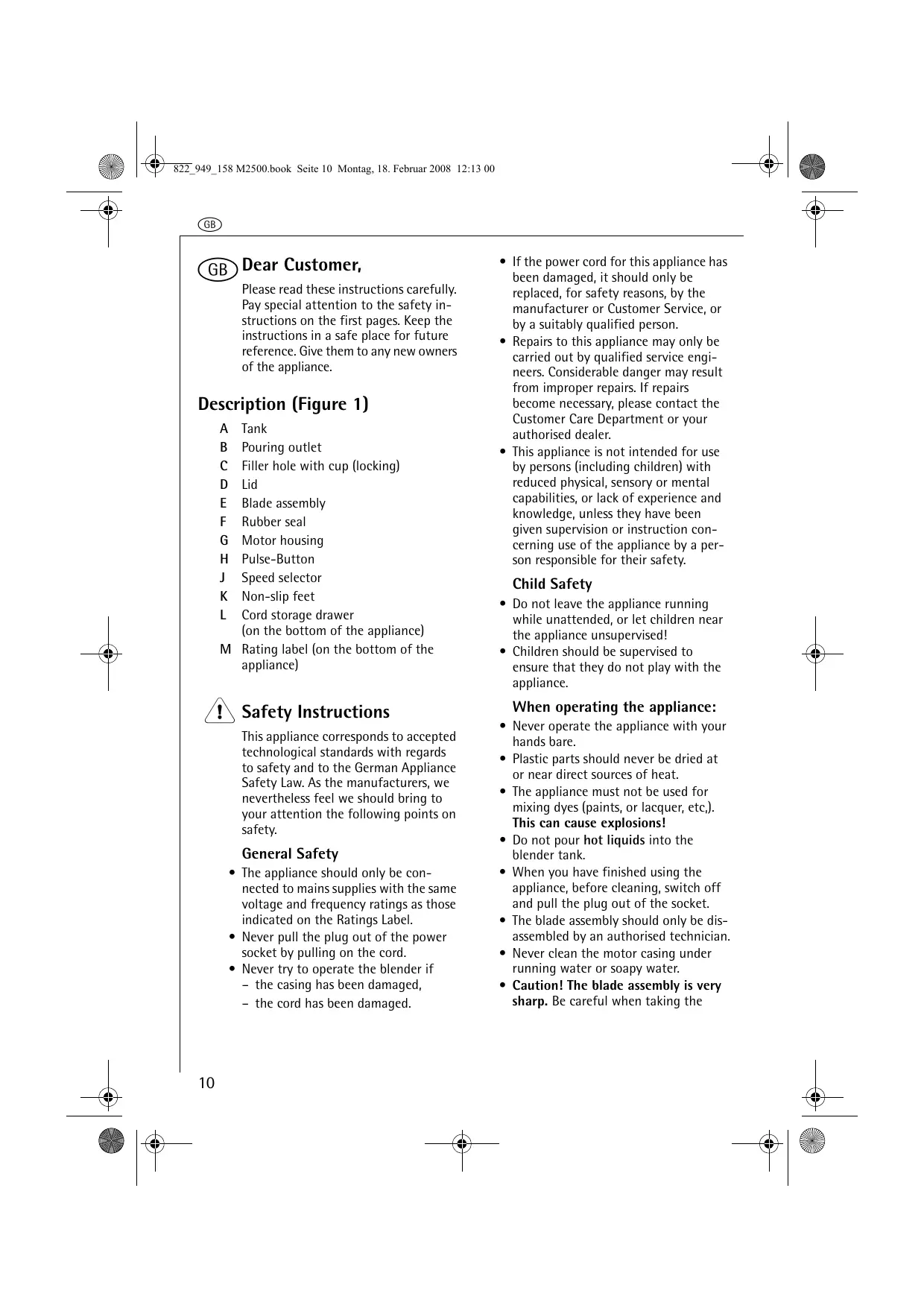 Tank Pouring outlet Filler hole with cup (locking) Lid Blade assembly Rubber seal Motor housing Pulse-Button Speed selector Non-slip feet Cord storage drawer (on the bottom of the appliance) M Rating label (on the bottom of the appliance) 1 Safety Instructions This appliance corresponds to accepted technological standards with regards to safety and to the German Appliance Safety Law. As the manufacturers, we nevertheless feel we should bring to your attention the following points on safety. General Safety