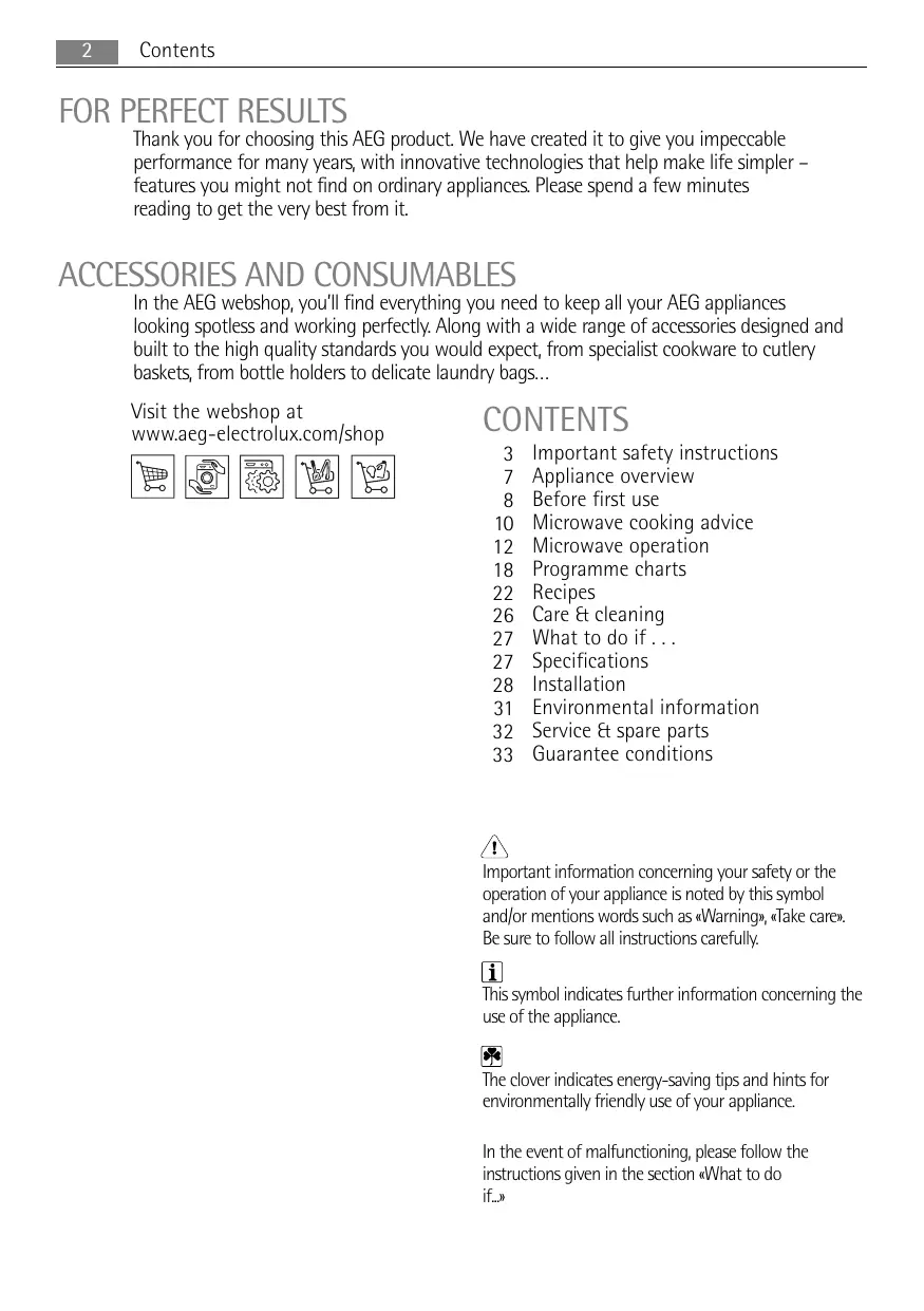 - Visit the webshop at www.aeg-electrolux.com/shop CONTENTS Important safety instructions ; Appliance overview 8 Before first use 10 Microwave cooking advice 12 Microwave operation 18 Programme charts 22 Recipes 26 Care & cleaning 27 Whattodoif Specifications 28 Installation 31 Environmental information 32 Service & spare parts 33 Guarantee conditions p. 27