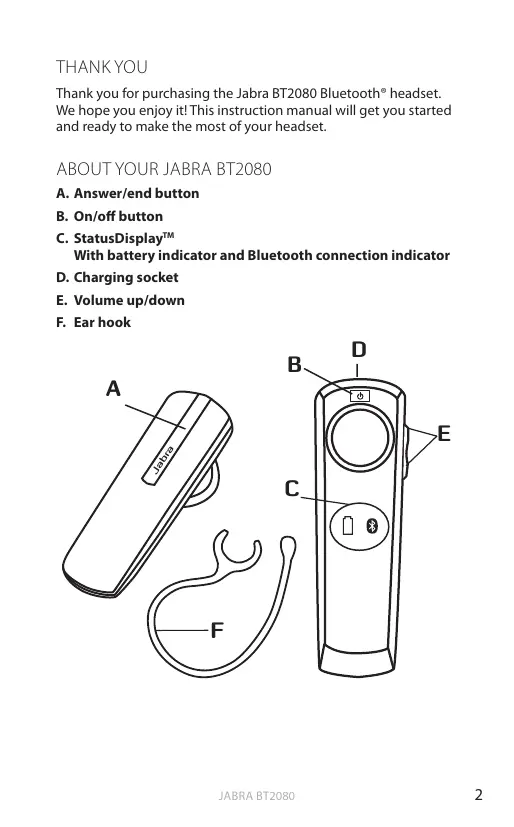 THANK YOU Thank you for purchasing the Jabra BT2080 Bluetooth® headset.