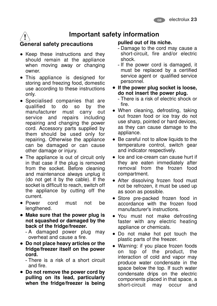 - Do not remove the power cord by pulling on its lead, particularly when the fridge/freezer is being