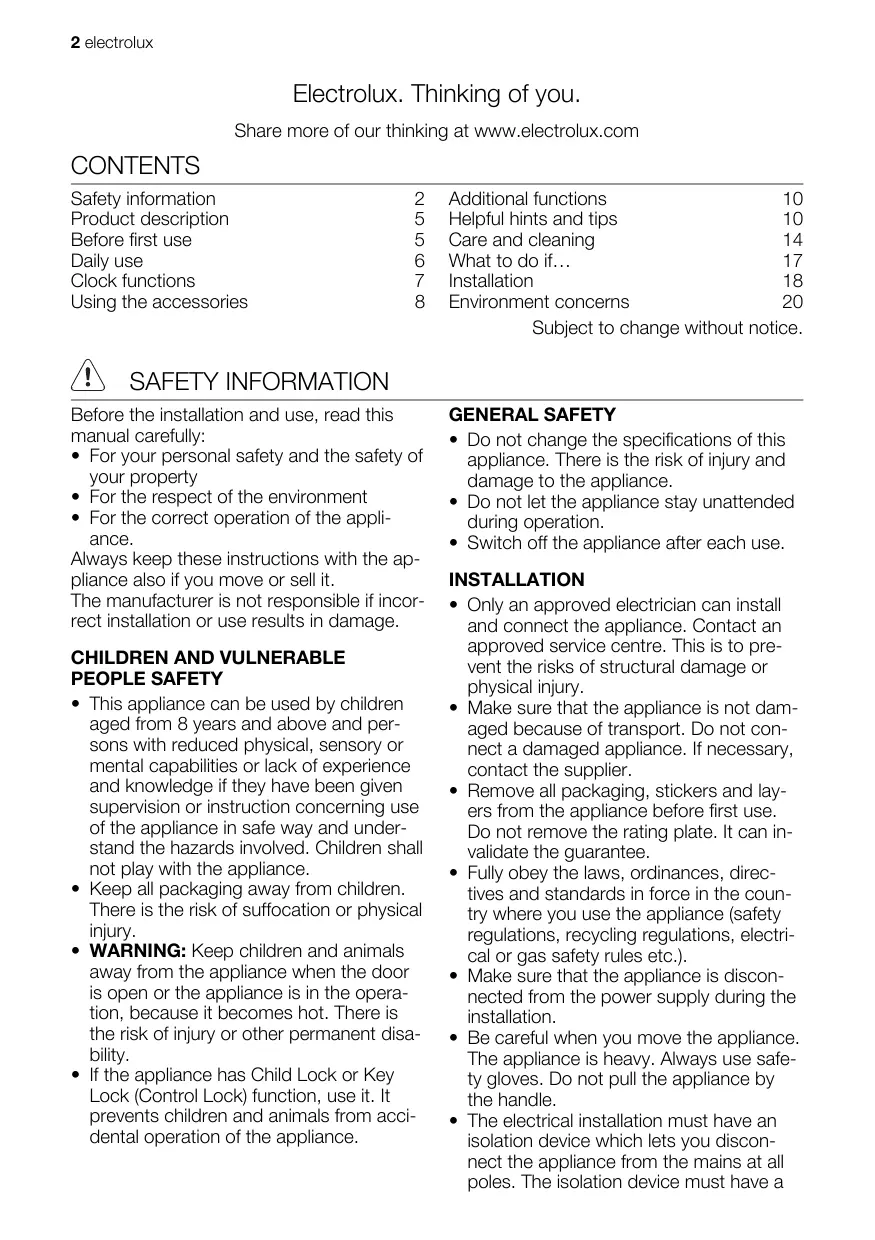 MANUAL DE INSTRUCCIONES 2 electrolux Electrolux. Thinking of you. Share more of our thinking at www.electrolux.com CONTENTS Safety information Product description Before first use Daily use Clock functions Using the accessories