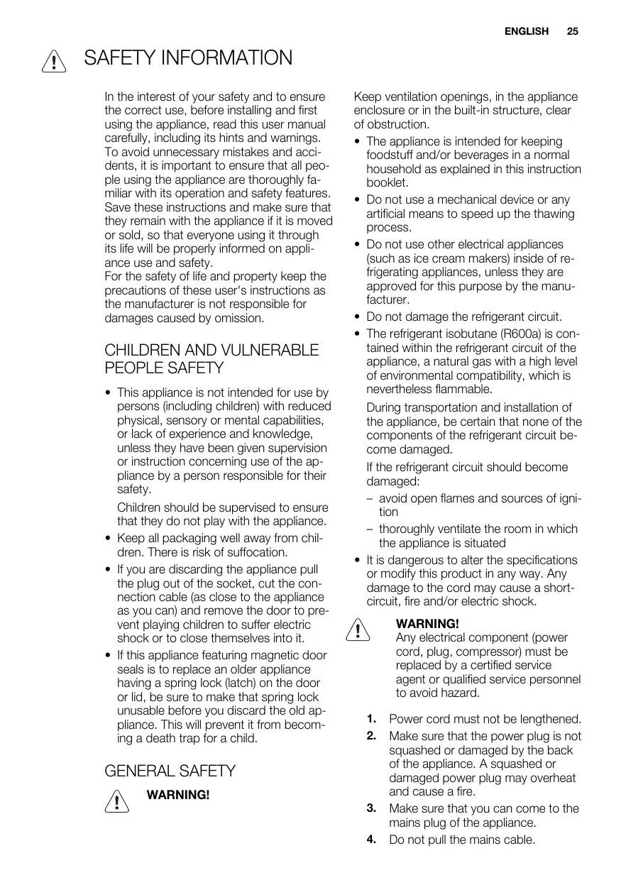 Power cord must not be lengthened. Make sure that the power plug is not squashed or damaged by the back of the appliance. A squashed or damaged power plug may overheat and cause a fire. Make sure that you can come to the mains plug of the appliance. Do not pull the mains cable. 26 www.electrolux.com