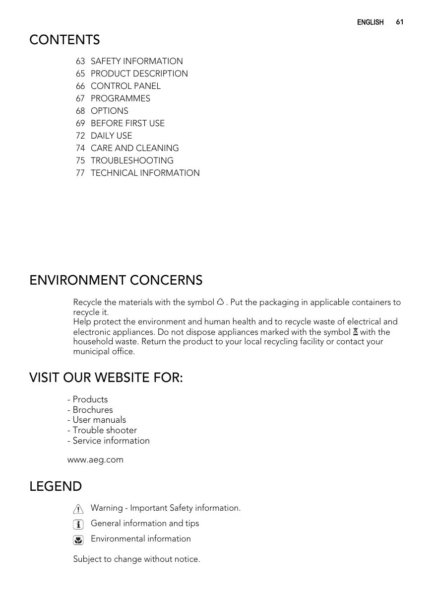 TROUBLESHOOTING TECHNICAL INFORMATION ENVIRONMENT CONCERNS Recycle the materials with the symbol . Put the packaging in applicable containers to recycle it. Help protect the environment and human health and to recycle waste of electrical and electronic appliances. Do not dispose appliances marked with the symbol with the household waste. Return the product to your local recycling facility or contact your municipal office. VISIT OUR WEBSITE FOR: - Products - Brochures - User manuals - Trouble shooter - Service information www.aeg.com LEGEND Warning - Important Safety information. General information and tips Environmental information Subject to change without notice. 62 www.aeg.com