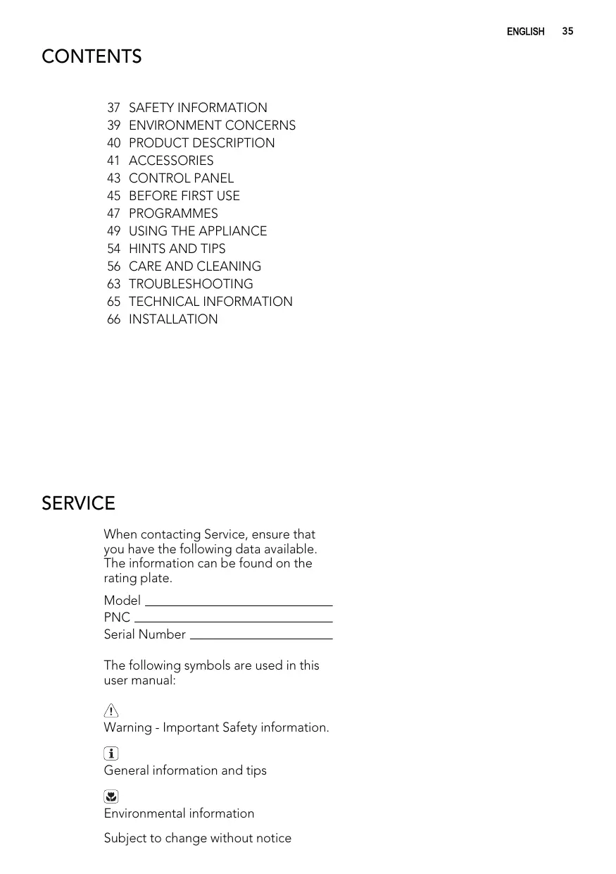 63 TROUBLESHOOTING 65 TECHNICAL INFORMATION 66 INSTALLATION SERVICE When contacting Service, ensure that you have the following data available The information can be found on the rating plate. Model PNC Serial Number The following symbols are used in this user manual