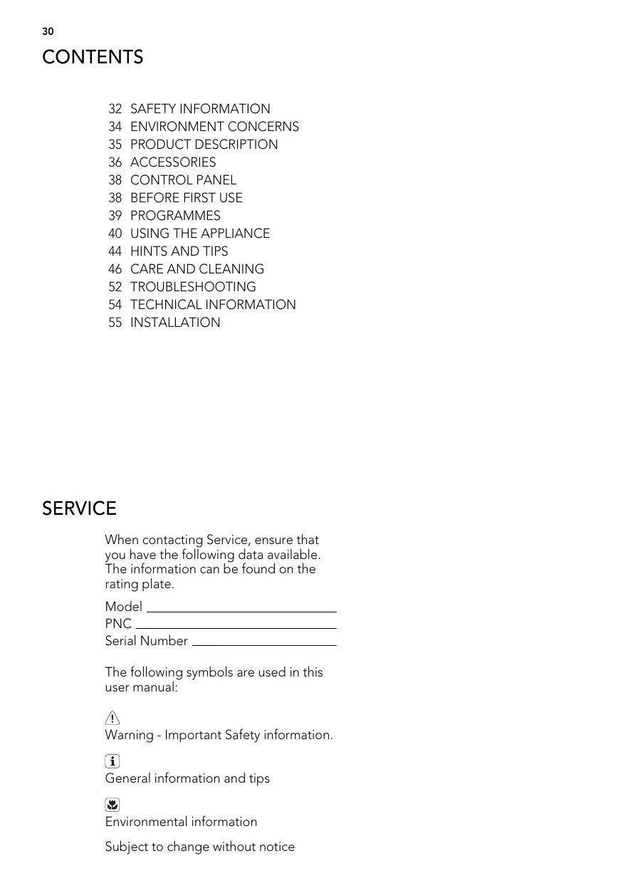 52 TROUBLESHOOTING 54 TECHNICAL INFORMATION 55 INSTALLATION SERVICE When contacting Service, ensure that you have the following data available The information can be found on the rating plate. Model PNC Serial Number The following symbols are used in this user manual