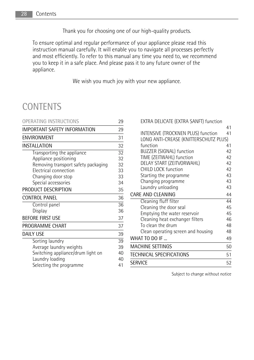 Contents Thank you for choosing one of our high-quality products. To ensure optimal and regular performance of your appliance please read this instruction manual carefully. It will enable you to navigate all processes perfectly and most efficiently. To refer to this manual any time you need to, we recommend you to keep it in a safe place. And please pass it to any future owner of the We wish you much joy with your new appliance. appliance. OPERATING INSTRUCTIONS 29