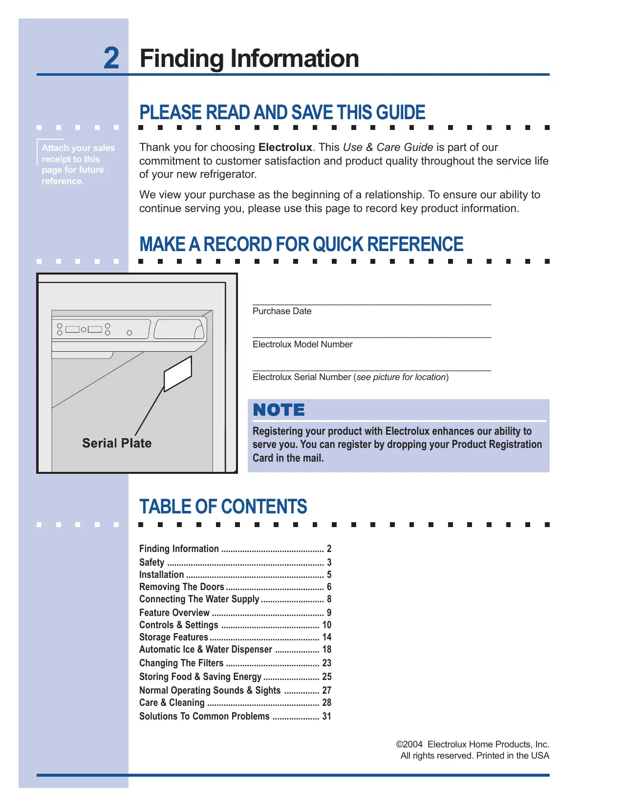 TABLE OF CONTENTS Finding Information Safety … Installation Removing The Doors Connecting The Water Supply. Feature Overvie Controls & Setting; Storage Feature: Automatic Ice & Water Dispenser Changing The Filters … Storing Food & Saving Energy Normal Operating Sounds & Sights Care & Cleaning … Solutions To Common Problems .
