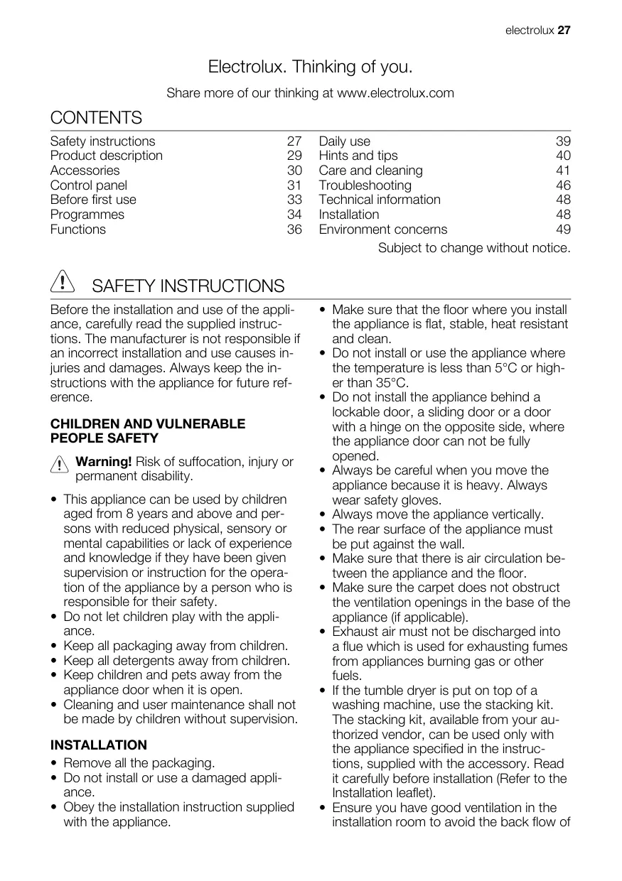 electrolux 27 Electrolux. Thinking of you. Share more of our thinking at www.electrolux.com CONTENTS Safety instructions 27 Daily use 39 Product description 29 Hints and tips 40 Accessories 30 Care and cleaning 41 Control panel 31 Troubleshooting 46 Before first use 33 Technical information 48 Programmes 34 Installation 48 Functions 36 Environment concerns 49