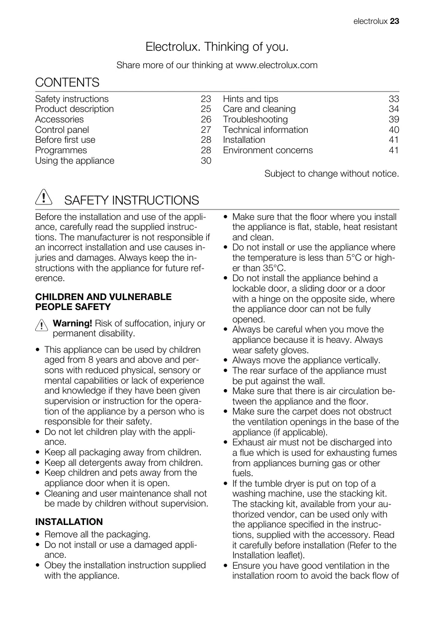 electrolux 23 Electrolux. Thinking of you. Share more of our thinking at www.electrolux.com CONTENTS Safety instructions 23 Hints and tips 33 Product description 25 Care and cleaning 34 Accessories 26 Troubleshooting 39 Control panel 27 Technical information 40 Before first use 28 Installation at Programmes 28 Environment concerns ai Using the appliance 30