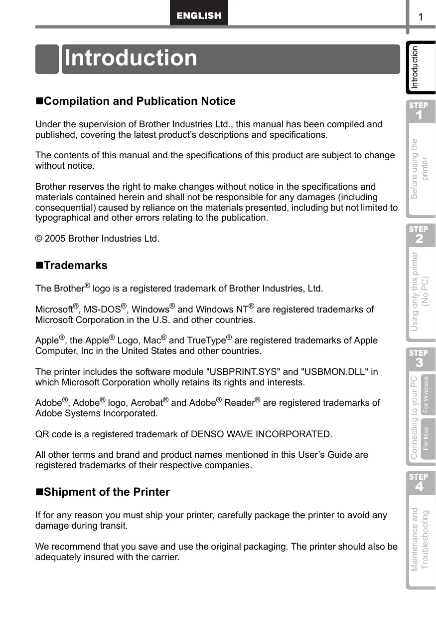 Trademarks The Brother® logo is a registered trademark of Brother Industries, Ltd. Microsoft®, MS-DOS®, Windows® and Windows NT® are registered trademarks of Microsoft Corporation in the U.S. and other countries. Apple®, the Apple® Logo, Mac® and TrueType® are registered trademarks of Apple Computer, Inc in the United States and other countries. The printer includes the software module "USBPRINT.SYS" and "USBMON.DLL" in which Microsoft Corporation wholly retains its rights and interests. Adobe®, Adobe® logo, Acrobat® and Adobe® Reader® are registered trademarks of Adobe Systems Incorporated. QR code is a registered trademark of DENSO WAVE INCORPORATED. All other terms and brand and product names mentioned in this User’s Guide are registered trademarks of their respective companies.