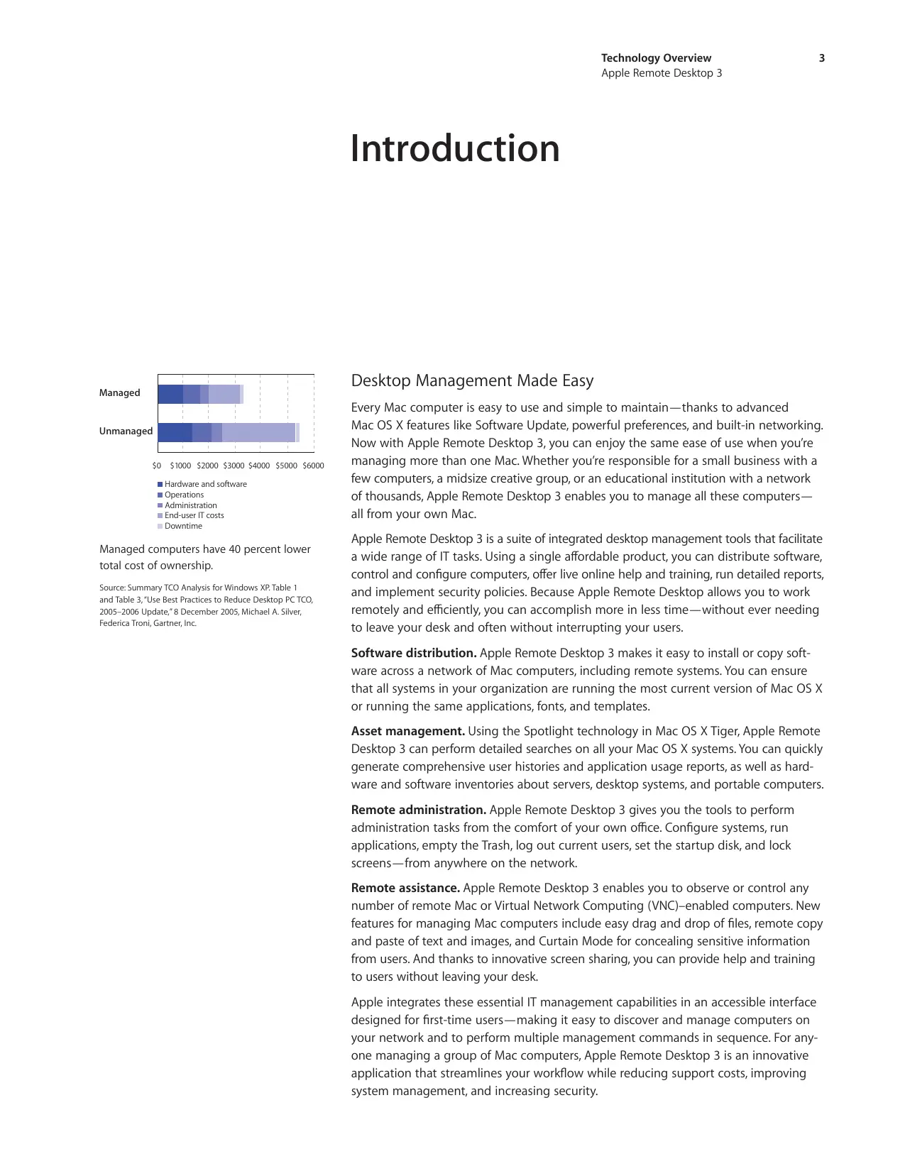 Apple Remote Desktop 3 is a suite of integrated desktop management tools that facilitate a wide range of IT tasks. Using a single affordable product, you can distribute software, control and configure computers, offer live online help and training, run detailed reports, and implement security policies. Because Apple Remote Desktop allows you to work remotely and efficiently, you can accomplish more in less time—without ever needing to leave your desk and often without interrupting your users.