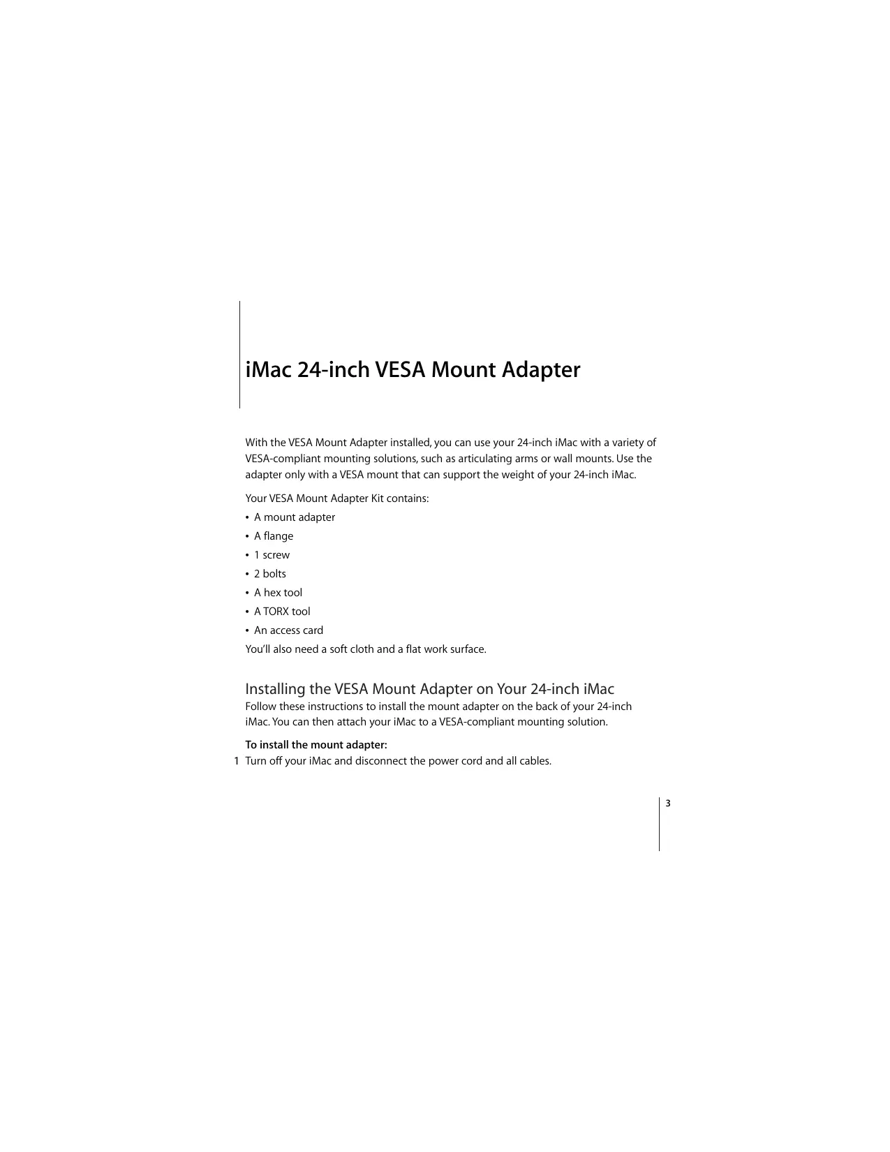 iMac 24-inch VESA Mount Adapter With the VESA Mount Adapter installed, you can use your 24-inch iMac with a variety of VESA-compliant mounting solutions, such as articulating arms or wall mounts. Use the adapter only with a VESA mount that can support the weight of your 24-inch iMac. Your VESA Mount Adapter Kit contains:  A mount adapter  A flange  1 screw  2 bolts  A hex tool  A TORX tool  An access card You’ll also need a soft cloth and a flat work surface. Installing the VESA Mount Adapter on Your 24-inch iMac Follow these instructions to install the mount adapter on the back of your 24-inch iMac. You can then attach your iMac to a VESA-compliant mounting solution. To install the mount adapter: 1 Turn off your iMac and disconnect the power cord and all cables.
