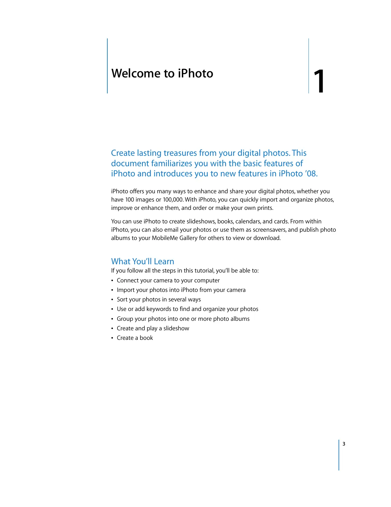 Welcome to iPhoto Create lasting treasures from your digital photos. This document familiarizes you with the basic features of iPhoto and introduces you to new features in iPhoto "08. iPhoto offers you many ways to enhance and share your digital photos, whether you have 100 images or 100,000. With iPhoto, you can quickly import and organize photos, improve or enhance them, and order or make your own prints. You can use iPhoto to create slideshows, books, calendars, and cards. From within iPhoto, you can also email your photos or use them as screensavers, and publish photo albums to your MobileMe Gallery for others to view or download. What You'll Learn If you follow all the steps in this tutorial, you'll be able to: + Connect your camera to your computer Import your photos into iPhoto from your camera Sort your photos in several ways Use or add keywords to find and organize your photos Group your photos into one or more photo albums Create and play a slideshow Create a book