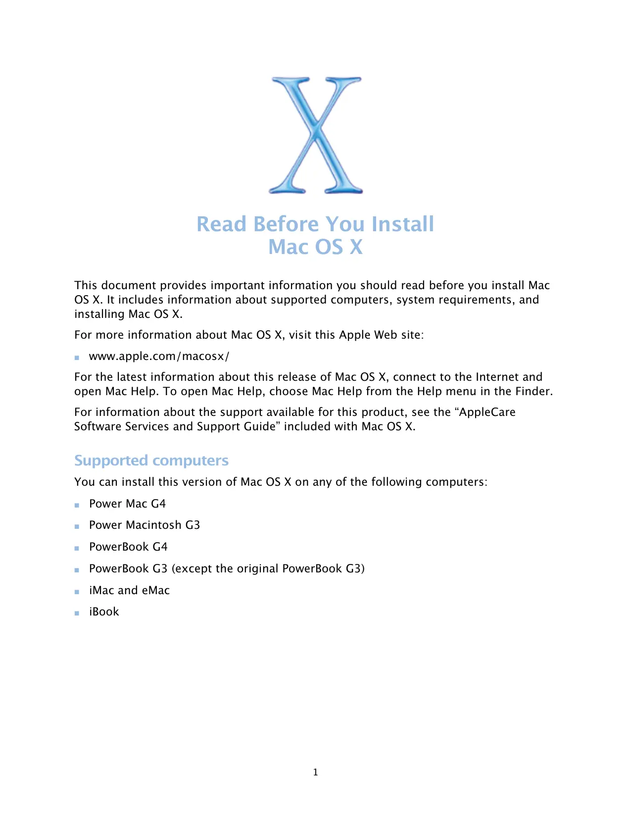 This document provides important information you should read before you install Mac OS X. It includes information about supported computers, system requirements, and installing Mac OS X.