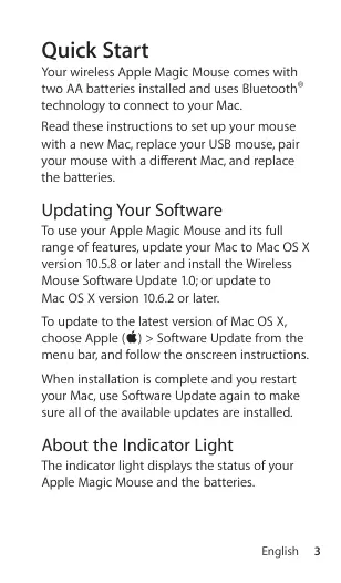Magic Mouse Quick Start Your wireless Apple Magic Mouse comes with two AA batteries installed and uses Bluetooth® technology to connect to your Mac. Read these instructions to set up your mouse with a new Mac, replace your USB mouse, pair your mouse with a different Mac, and replace the batteries. Updating Your Software To use your Apple Magic Mouse and its full range of features, update your Mac to Mac OS X version 10.5.8 or later and install the Wireless Mouse Software Update 1.0; or update to Mac OS X version 10.6.2 or later. To update to the latest version of Mac OS X, choose Apple (K) > Software Update from the menu bar, and follow the onscreen instructions. When installation is complete and you restart your Mac, use Software Update again to make sure all of the available updates are installed. About the Indicator Light The indicator light displays the status of your Apple Magic Mouse and the batteries. English