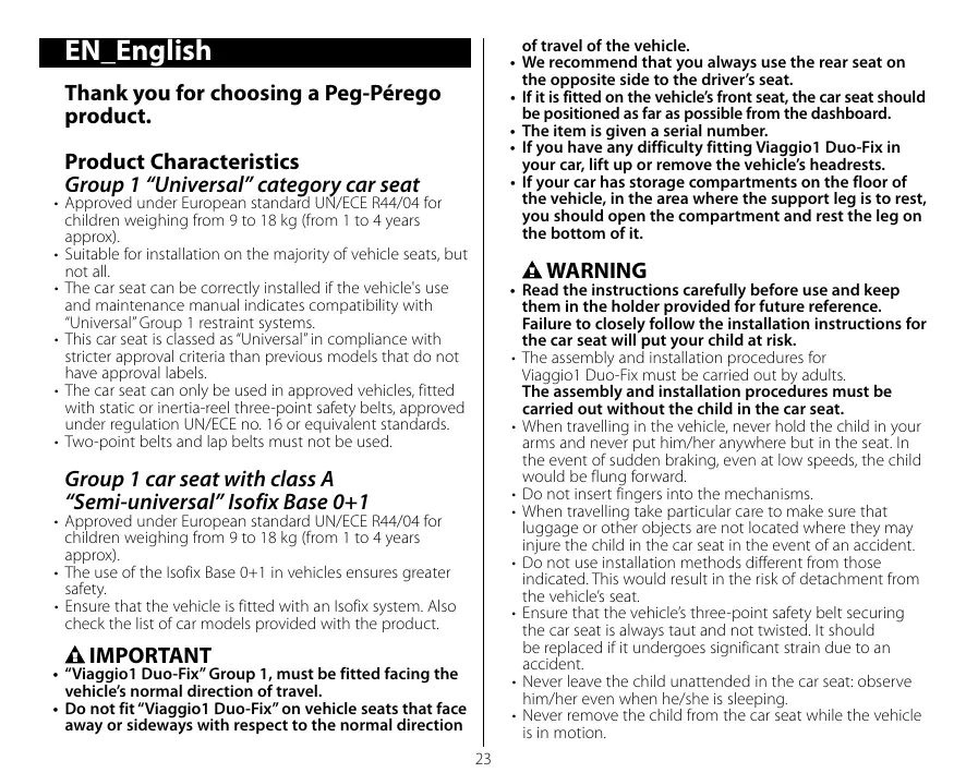 • “Viaggio1 Duo-Fix” Group 1, must be fitted facing the vehicle’s normal direction of travel.