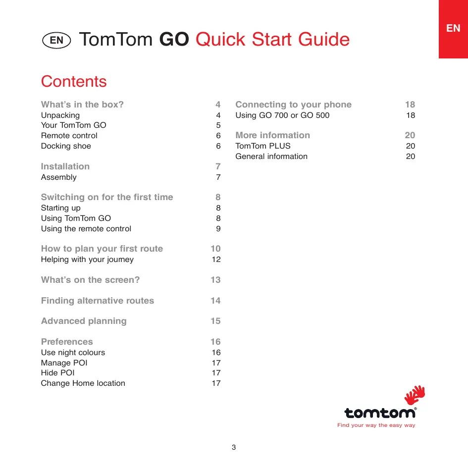 ŒN)>) TomTom GO Quick Start Guide Contents What's in the box? Unpacking Your TomTom GO Remote control Docking shoe Installation Assembly Switching on for the first time Starting up Using TomTom GO Using the remote control How to plan your first route Helping with your joumey What's on the screen? Finding alternative routes Advanced planning Preferences Use night colours Manage POI Hide POI Change Home location oouses Connecting to your phone 18 Using GO 700 or GO 500 More information TomTom PLUS General information