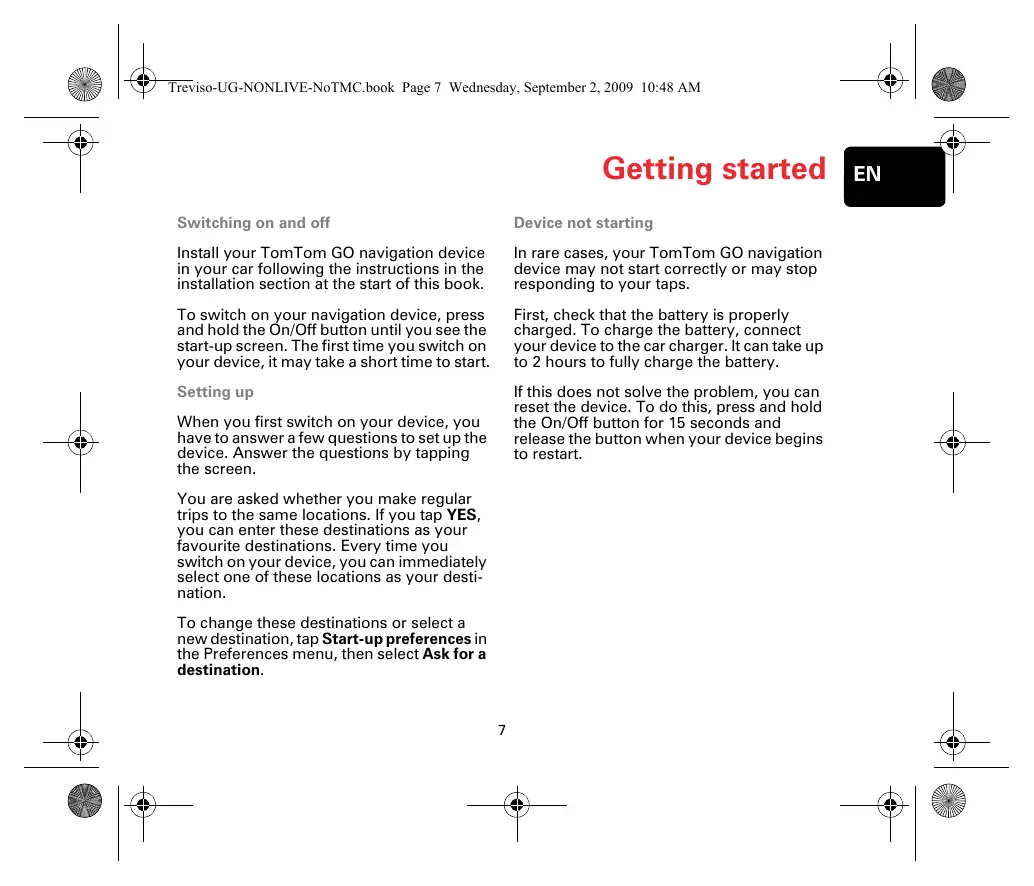 Switching on and off Install your TomTom GO navigation device in your car following the instructions in the installation section at the start of this book. To switch on your navigation device, press and hold the On/Off button until you see the start-up screen. The first time you switch on your device, it may take a short time to start. Setting up When you first switch on your device, you have to answer a few questions to set up the device. Answer the questions by tapping the screen. You are asked whether you make regular trips to the same locations. If you tap YES, you can enter these destinations as your favourite destinations. Every time you switch on your device, you can immediately select one of these locations as your desti- nation. To change these destinations or select a new destination, tap Start-up preferences in the Preferences menu, then select Ask for a destination. Getting started Device not starting In rare cases, your TomTom GO navigation device may not start correctly or may stop responding to your taps. First, check that the battery is properly charged. To charge the battery, connect your device to the car charger. lt can take up to 2 hours to fully charge the battery. this does not solve the problem, you can reset the device. To do this, press and hold the On/Off button for 15 seconds and release the button when your device begins to restart.