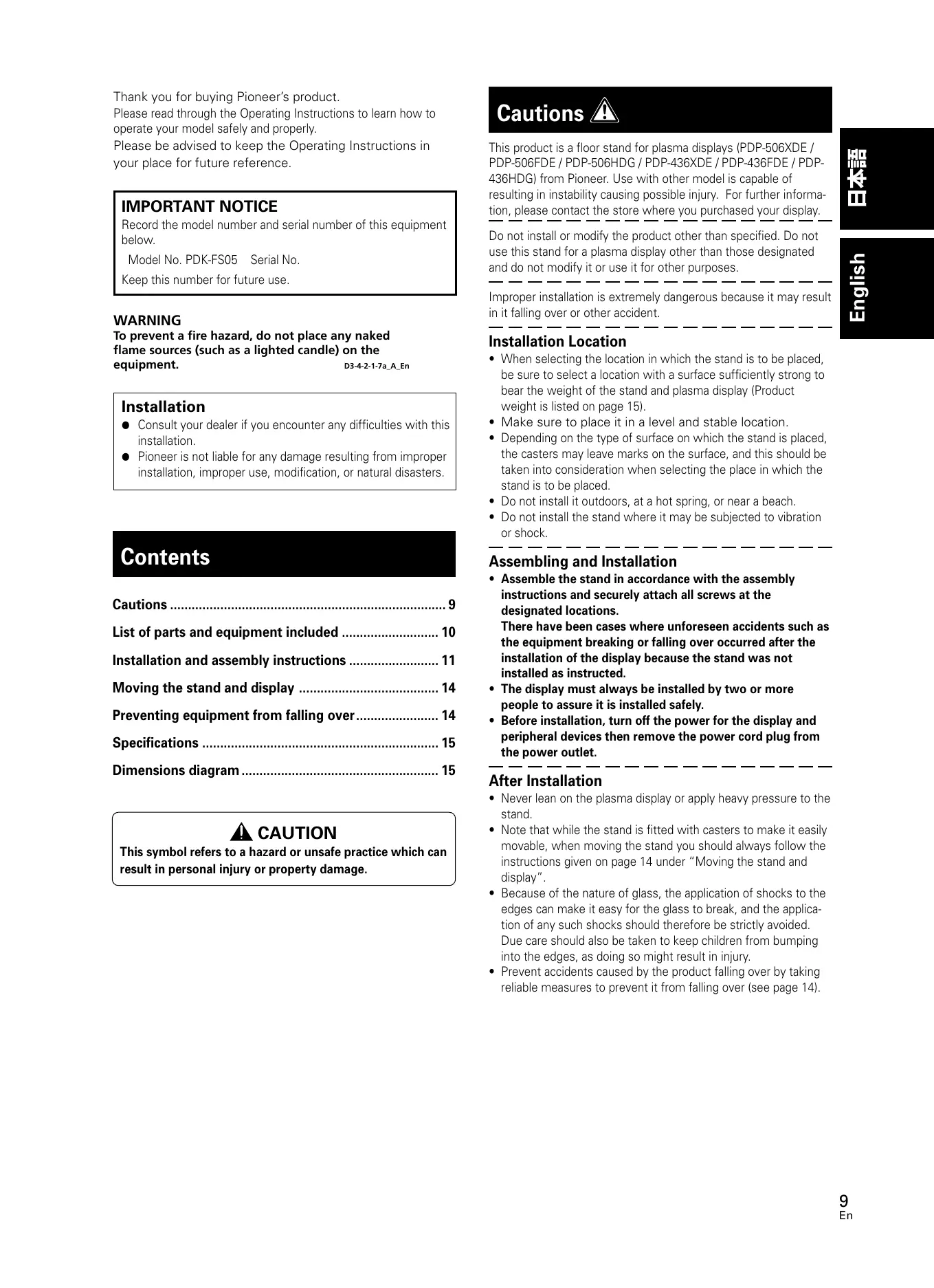 Record the model number and serial number of this equipment below. Model No. PDK-FS05 Serial No. This product is a floor stand for plasma displays (PDP-506XDE / PDP-506FDE / PDP-506HDG / PDP-436XDE / PDP-436FDE / PDP436HDG) from Pioneer. Use with other model is capable of resulting in instability causing possible injury. For further information, please contact the store where you purchased your display.