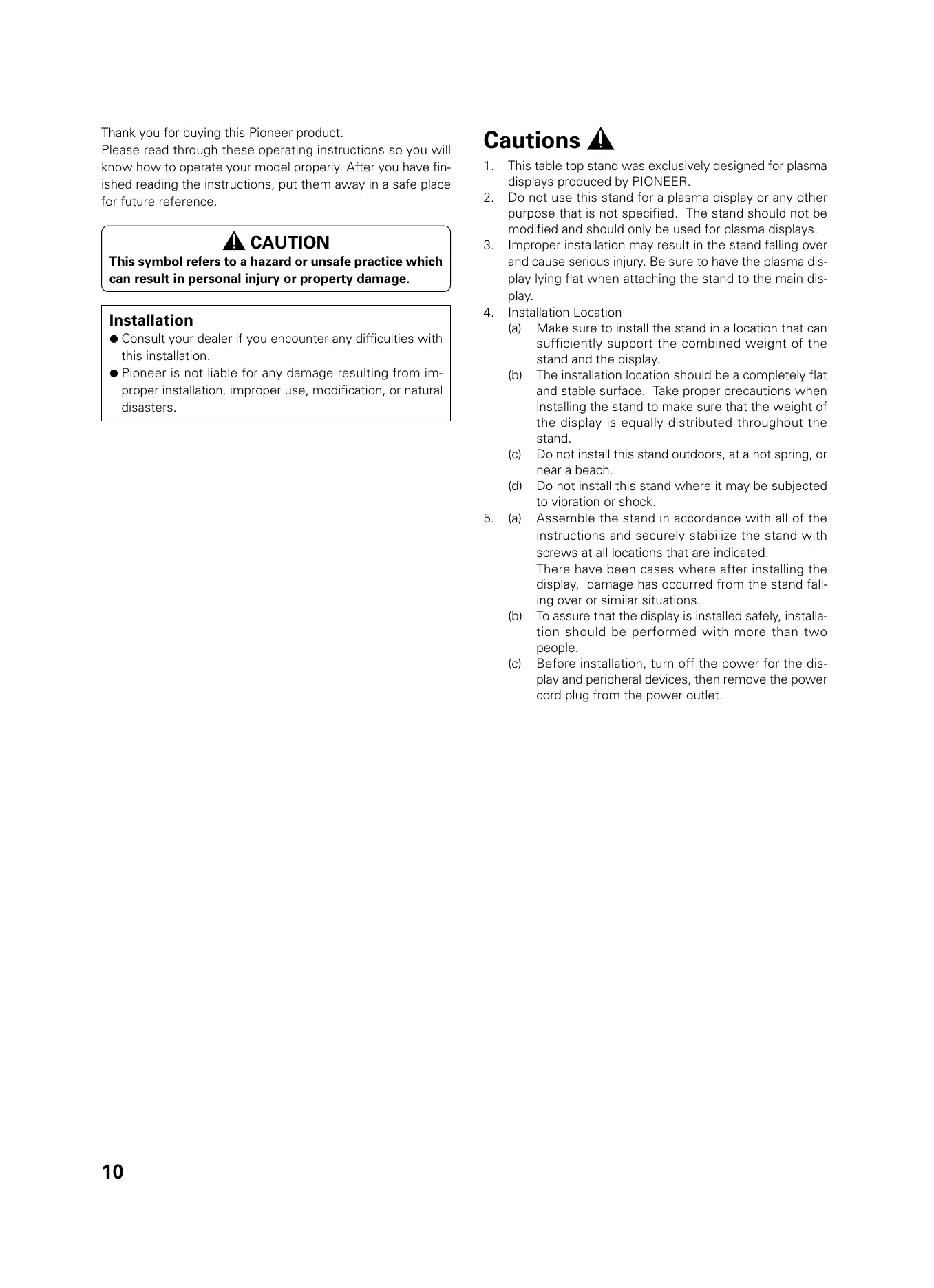 This table top stand was exclusively designed for plasma displays produced by PIONEER. Do not use this stand for a plasma display or any other purpose that is not specified. The stand should not be modified and should only be used for plasma displays. Improper installation may result in the stand falling over and cause serious injury. Be sure to have the plasma display lying flat when attaching the stand to the main display. Installation Location (a) Make sure to install the stand in a location that can sufficiently support the combined weight of the stand and the display. (b) The installation location should be a completely flat and stable surface. Take proper precautions when installing the stand to make sure that the weight of the display is equally distributed throughout the stand. (c) Do not install this stand outdoors, at a hot spring, or near a beach. (d) Do not install this stand where it may be subjected to vibration or shock. (a) Assemble the stand in accordance with all of the instructions and securely stabilize the stand with screws at all locations that are indicated. There have been cases where after installing the display, damage has occurred from the stand falling over or similar situations. (b) To assure that the display is installed safely, installation should be performed with more than two people. (c) Before installation, turn off the power for the display and peripheral devices, then remove the power cord plug from the power outlet.
