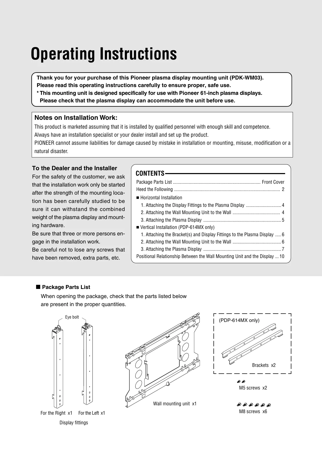 CONTENTS Package Parts List Front Cover Heed the Following 2 Horizontal Installation 1. Attaching the Display Fittings to the Plasma Display 4 2. Attaching the Wall Mounting Unit to the Wall 4 3. Attaching the Plasma Display 5 Vertical Installation (PDP-614MX only) 1. Attaching the Bracket(s) and Display Fittings to the Plasma Display 6 2. Attaching the Wall Mounting Unit to the Wall 6 3. Attaching the Plasma Display 7 Positional Relationship Between the Wall Mounting Unit and the Display ... 10