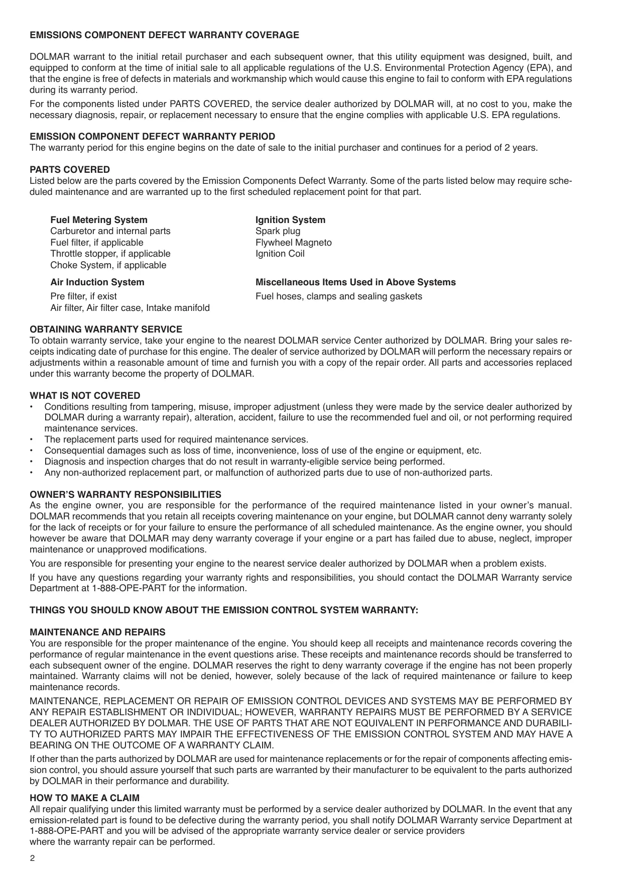 As the engine owner, you are responsible for the performance of the required maintenance listed in your owner’s manual. DOLMAR recommends that you retain all receipts covering maintenance on your engine, but DOLMAR cannot deny warranty solely for the lack of receipts or for your failure to ensure the performance of all scheduled maintenance. As the engine owner, you should however be aware that DOLMAR may deny warranty coverage if your engine or a part has failed due to abuse, neglect, improper maintenance or unapproved modifications. You are responsible for presenting your engine to the nearest service dealer authorized by DOLMAR when a problem exists. If you have any questions regarding your warranty rights and responsibilities, you should contact the DOLMAR Warranty service Department at 1-888-OPE-PART for the information. THINGS YOU SHOULD KNOW ABOUT THE EMISSION CONTROL SYSTEM WARRANTY: