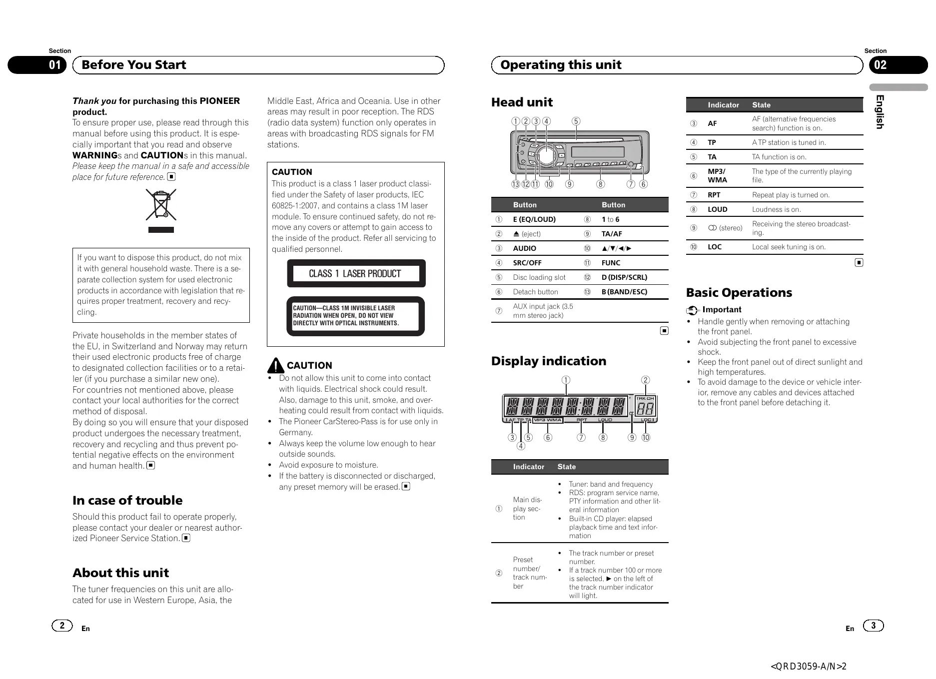 Section Section [ _o1] (Before You Start D (Operating this unit D Thank you for purchasing this PIONEER product. Middle East, Africa and Oceania. Use in other areas may result in poor reception, The RDS Head unit Indicator State To ensure proper use, please read through this (radio data system) function only operates in ® AF AF (ltermnative frequencies _L search) function is on. manual before using this product. lt is espe- areas with broadcasting RDS signals for FM cially important that you read and observe stations. TP. ATP station is tuned in: WARNINGs and CAUTIONS in this manual a) TA TA function is on: i r=rrrTe) Pr ie re in a safe and accessible CAUTION 2 MP3/ The type of the currently playing P : This product is a class 1 laser product classi © WMA file fied under the Safety of laser products, IEC RPT Repeat play is turned on 60825-12007 and contains a class 1M laser LOUD Laine on module. To ensure continued safety, do not re- D EŒQ/LOUD) © 1106 = con EE move any covers or attempt to gain access to — = ® (stereo) eue 1e stereo broadcasl the inside of the product. Refer all servicing to D A (ect) 9 TA/AF qualified personnel 5 AUDIO 10 A/v/4» d LOC Local seek tuning is on. If you want to dispose this product, do not mix D SRUGI FT © it with general household waste. There is à se- - - parate collection system for used electronic 5 Discloadingsiot (2 D(DISP/SCRL) products in accordance with legislation that re- ® Detach button 13 B(BAND/ESC) Basic Operations quires proper treatment, recovery and recy- n = | ICAUTION—-CLASS 1M INVISIBLE LASER AUX input jack (8.5 - Important cling [RADIATION WHEN OPEN, DO NOT VIEW mm stereo jack) DIRECTLY WITH OPTICAL INSTRUMENTS. + Handle gently when removing or attaching Private households in the member states of O)] the front panel he EU, in Switzerland and Norway may return + Avoid subjecting the front panel to excessive their used electronic products free of charge to designated collection facilities or to a retai- ler (if you purchase a similar new one). For countries not mentioned above, please contact your local authorities for the correct method of disposal By doing so you will ensure that your disposed product undergoes the necessary treatment, recovery and recycling and thus prevent po- tential negative effects on the environment and human health. (=) À caurion + _ Do not allow this unit to come into contact with liquids. Electrical shock could result. Also, damage to this unit, smoke, and over- heating could result from contact with liquids. + The Pioneer CarStereo-Pass is for use only in Germany. + Always keep the volume low enough to hear outside sounds. + Avoid exposure to moisture + _lfthe battery is disconnected or discharged, any preset memory will be erased. (=) Indicator State + Tuner: band and frequency + RDS: program service name, In case of trouble __ Main dis PTY information and other lit T play sec- eral information Should this product fail to operate proper, tion + Builtin CD player: elapsed please contact your dealer or nearest author- playback time and text infor- ized Pioneer Service Station. (=) mation + The track number or preset Preset number . . 5 number/ + fa track number 100 or more About this unit {rack num is selected, » on the left of The tuner frequencies on this unit are allo- cated for use in Western Europe, Asia, the CD en ber the track number indicator will light shock +_ Keep the front panel out of direct sunlight and high temperatures + To avoid damage to the device or vehicle inter ior, remove any cables and devices attached to the front panel before detaching it ë CG)