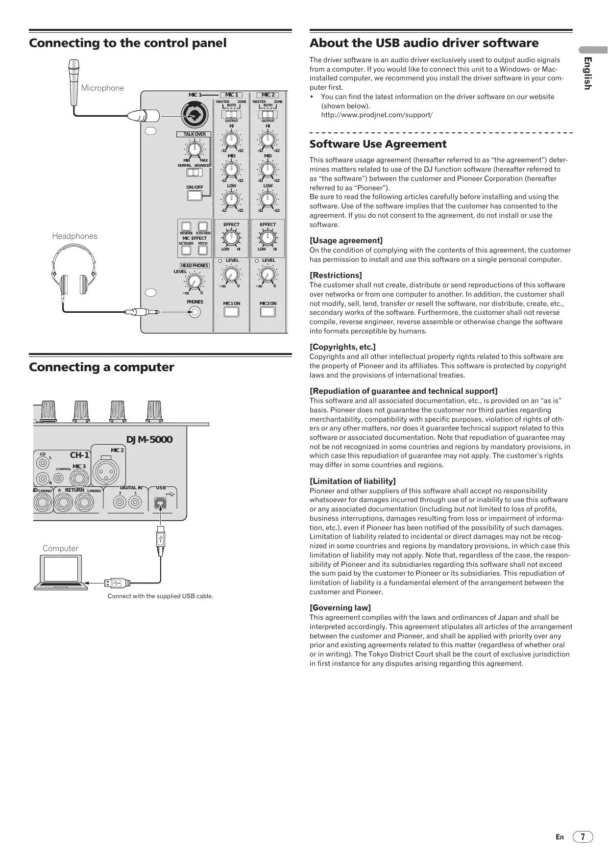 PHONES MIC1 ON MIC2 ON The customer shall not create, distribute or send reproductions of this software over networks or from one computer to another. In addition, the customer shall not modify, sell, lend, transfer or resell the software, nor distribute, create, etc., secondary works of the software. Furthermore, the customer shall not reverse compile, reverse engineer, reverse assemble or otherwise change the software into formats perceptible by humans. [Copyrights, etc.] Connecting a computer Copyrights and all other intellectual property rights related to this software are the property of Pioneer and its affiliates. This software is protected by copyright laws and the provisions of international treaties. [Repudiation of guarantee and technical support] DJM-5000